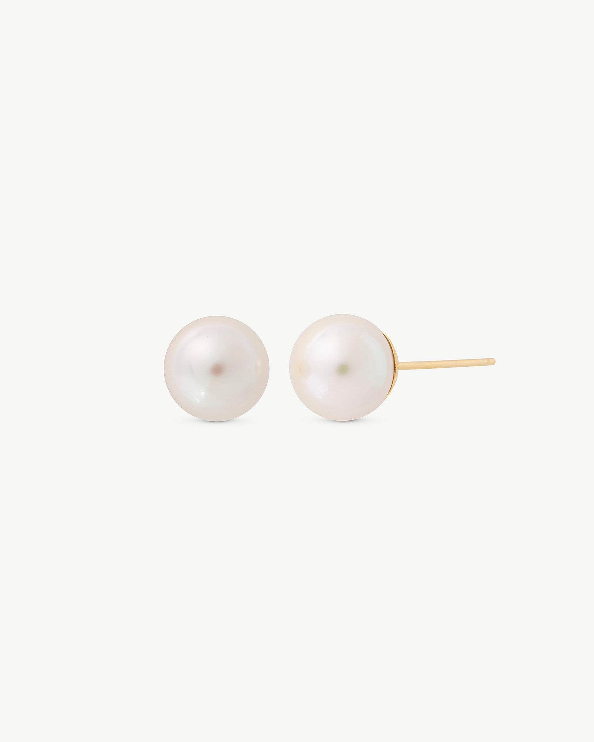 18k gold baby ball earrings with nut, 6mm white round pearl. The gold pearl earrings are the stars of the collection.