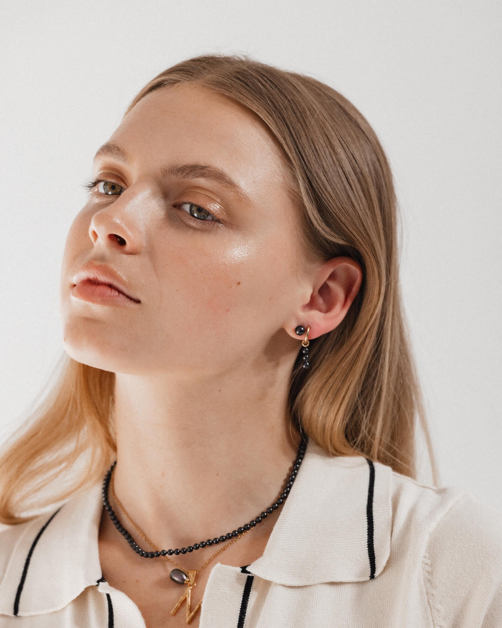 The collection offers a versatile chain base for hanging mini hoop or small hoop earrings, with 4 mm pearls in exclusive colors.