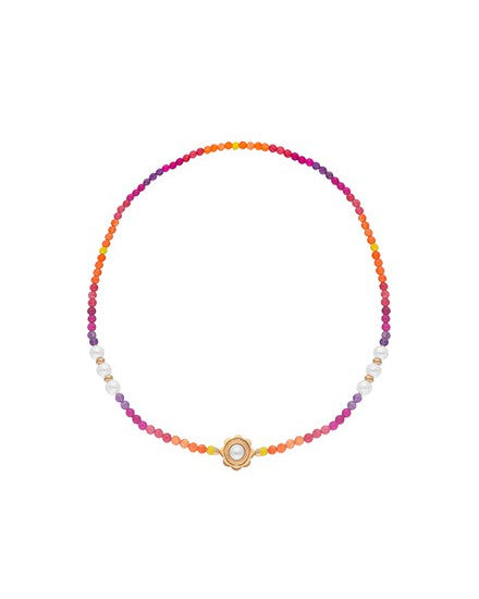 Silver necklace with gold plating and stones in gradient colors of sunset. 6mm white round pearls. 40cm long. Energy and fun of the 2000s If colorful jewelry is your thing, bet everything on the new collection iconic jewelry that is born from the color palette so representative of Y2K, today even elevated to a higher level.