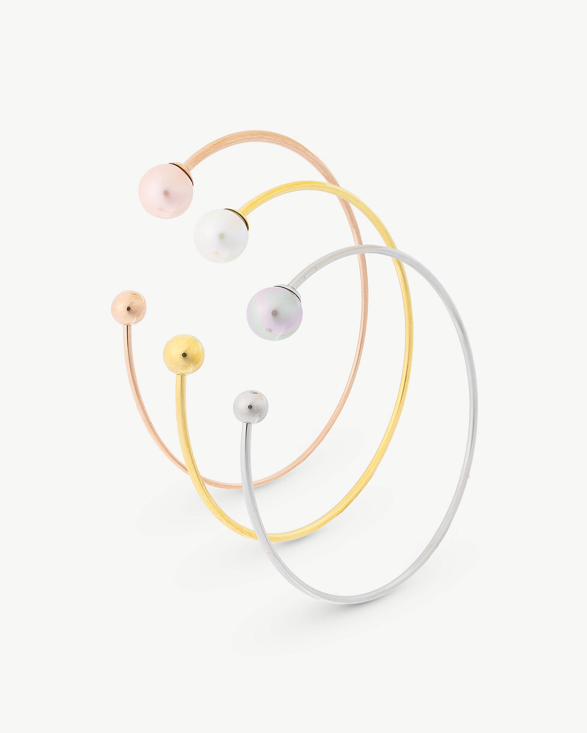 Set of 3 rigid bracelets 52x52mm in rhodium-plated titanium, gold and pink, with 8mm round pearl in white, nuage and pink and with a steel ball.Set of 3 rigid bracelets 52x52mm in rhodium-plated titanium, gold and pink, with 8mm round pearl in white, nuage and pink and with a steel ball.Set of 3 rigid bracelets 52x52mm in rhodium-plated titanium, gold and pink, with 8mm round pearl in white, nuage and pink and with a steel ball.
