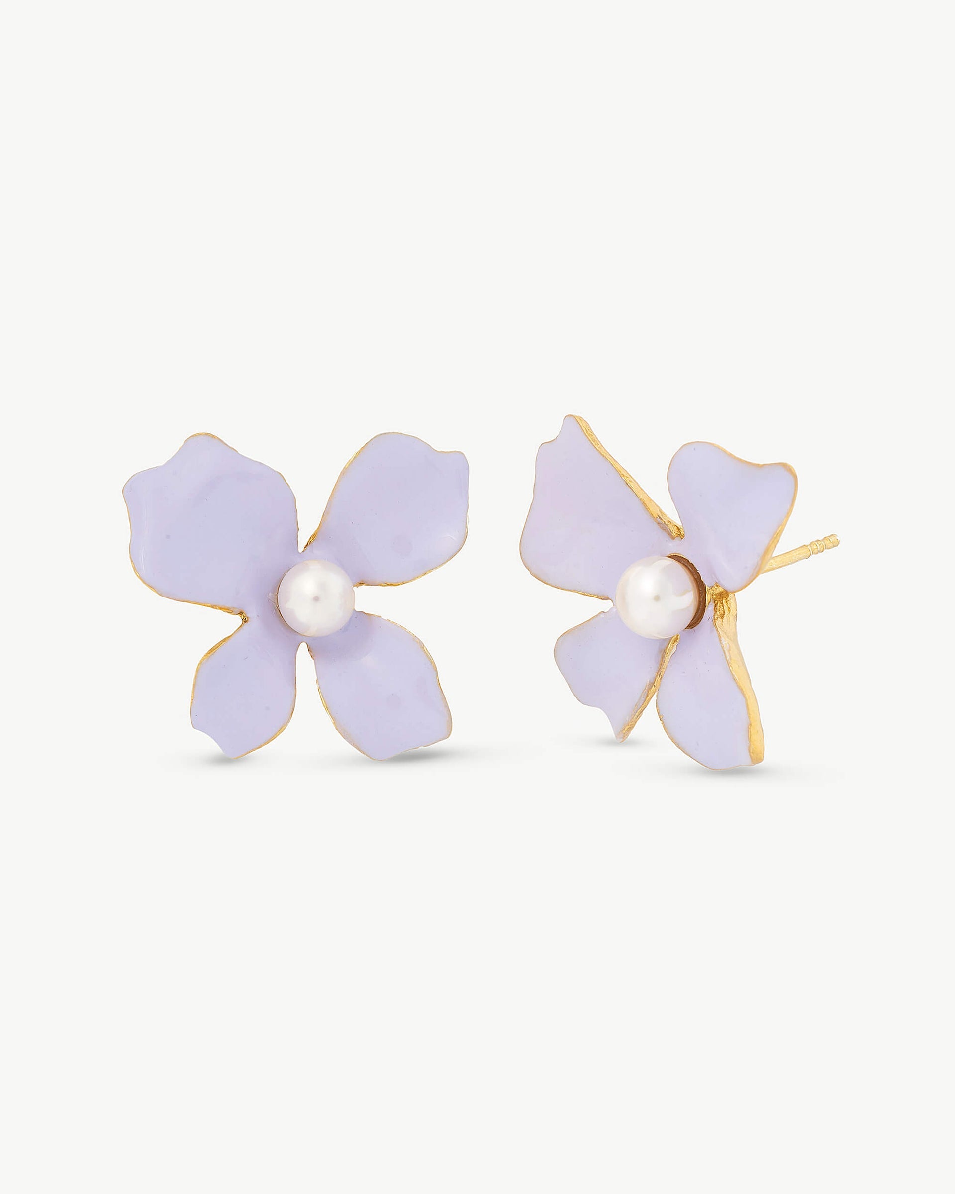 Golden silver spike earrings with lilac flower and 5mm round white pearls. The enameled flowers on 18k gold-plated silver shine for day and night occasions.The collection brings with it an explosion of color inspired by the beauty of flowers that give life to maximalist jewelry.Golden silver spike earrings with lilac flower and 5mm round white pearls. The enameled flowers on 18k gold-plated silver shine for day and night occasions. The collection brings with it an explosion of color inspired by the beauty of flowers that give life to maximalist jewelry.Golden silver spike earrings with lilac flower and 5mm round white pearls. The enameled flowers on 18k gold-plated silver shine for day and night occasions. The collection brings with it an explosion of color inspired by the beauty of flowers that give life to maximalist jewelry.