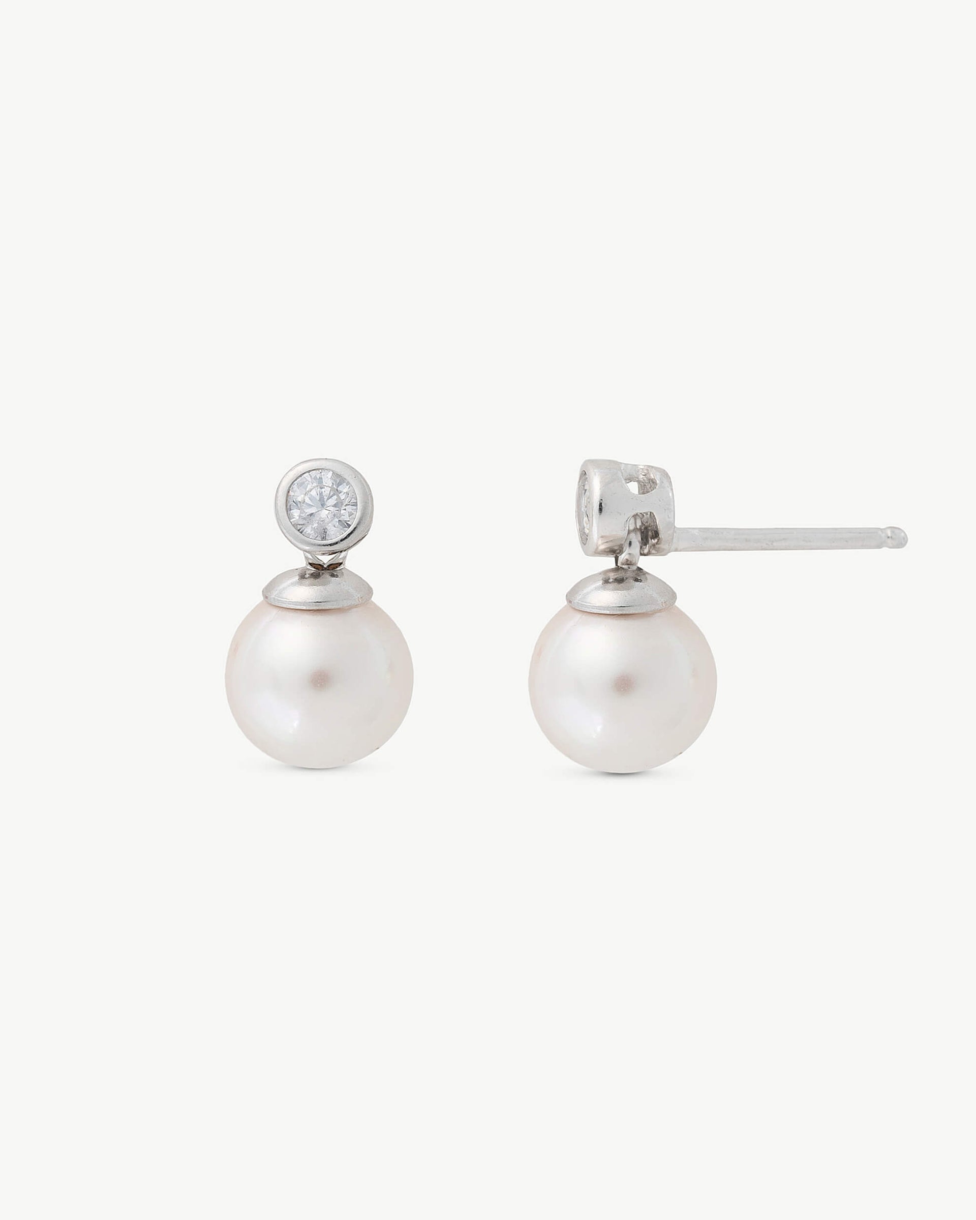 Short spike earrings in rhodium-plated silver, 6mm white round pearls and zircons. Jewelry for your daily life.