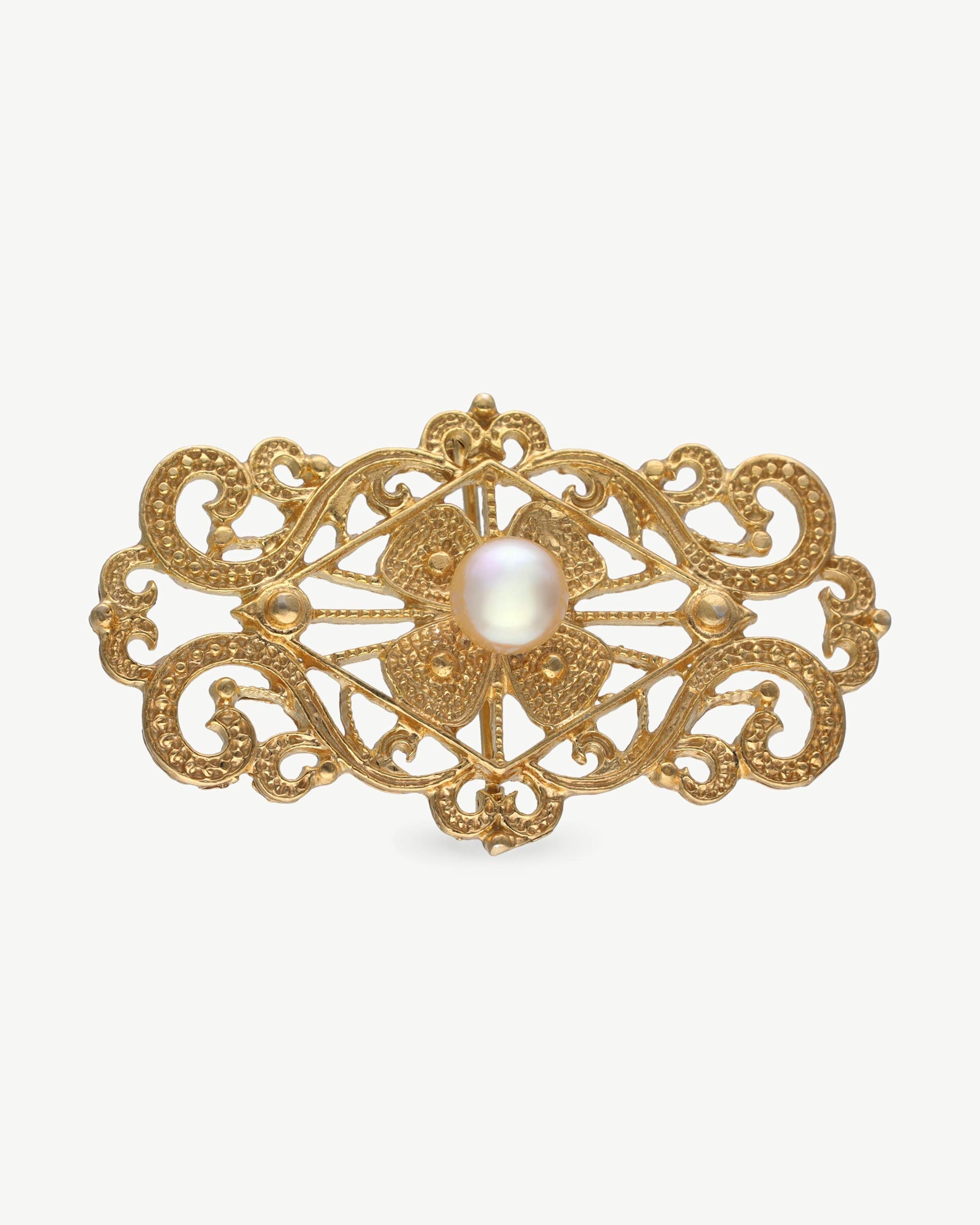 Brooch in gold-plated silver with a 7mm round cream-pink pearl. Retro brooches in silver and pearls that fit like chokers on the neck