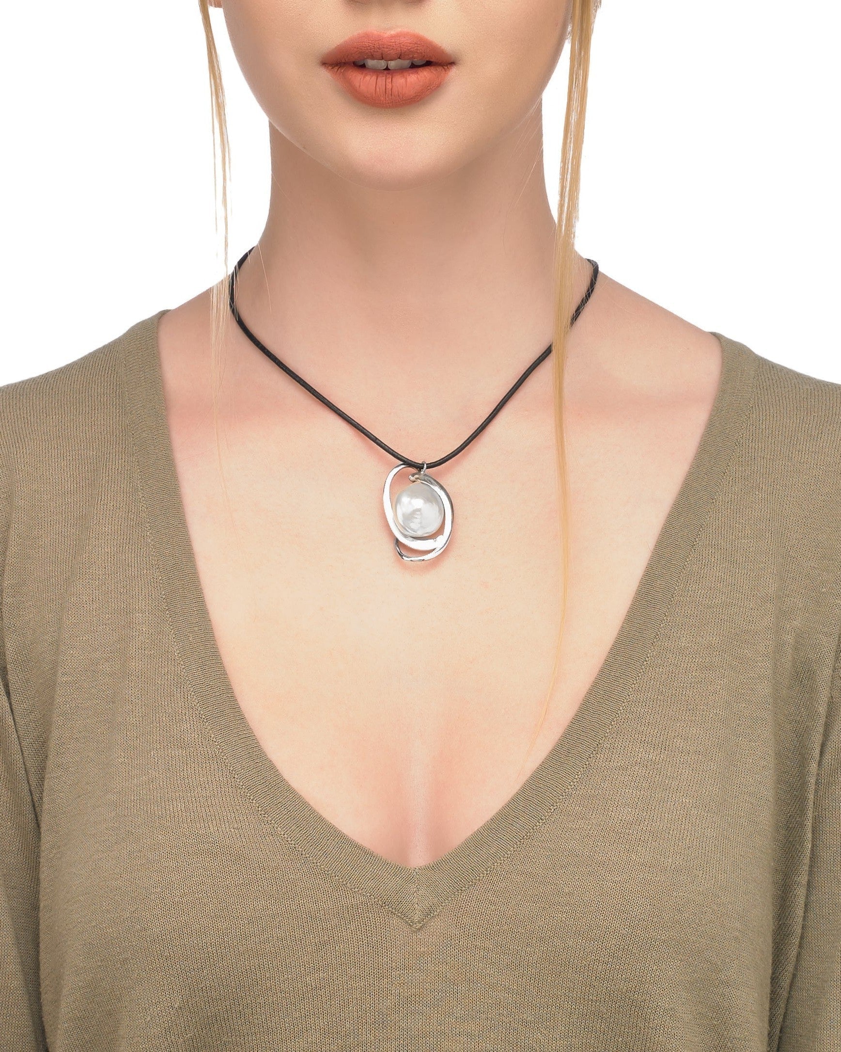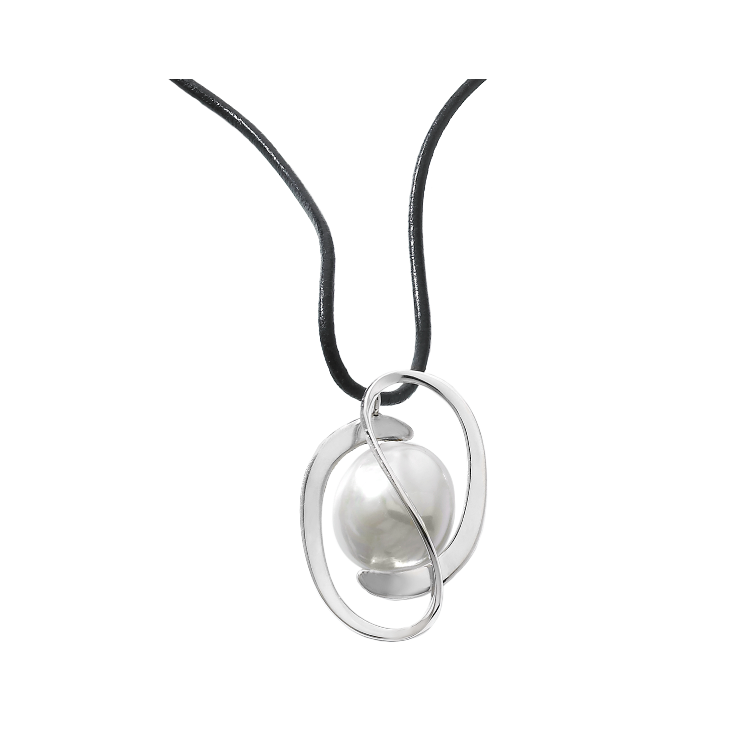 Pendant with leather cord in rhodium-plated silver, 18mm white bombshell oval pearl. The name of a fantastic island is used to name a collection of plant jewelry in which the pearl is the center of gravity and protagonist.Pendant with leather cord in rhodium-plated silver, 18mm white bombshell oval pearl. The name of a fantastic island is used to name a collection of plant jewelry in which the pearl is the center of gravity and protagonist.Pendant with leather cord in rhodium-plated silver, 18mm white bombshell oval pearl. The name of a fantastic island is used to name a collection of plant jewelry in which the pearl is the center of gravity and protagonist.