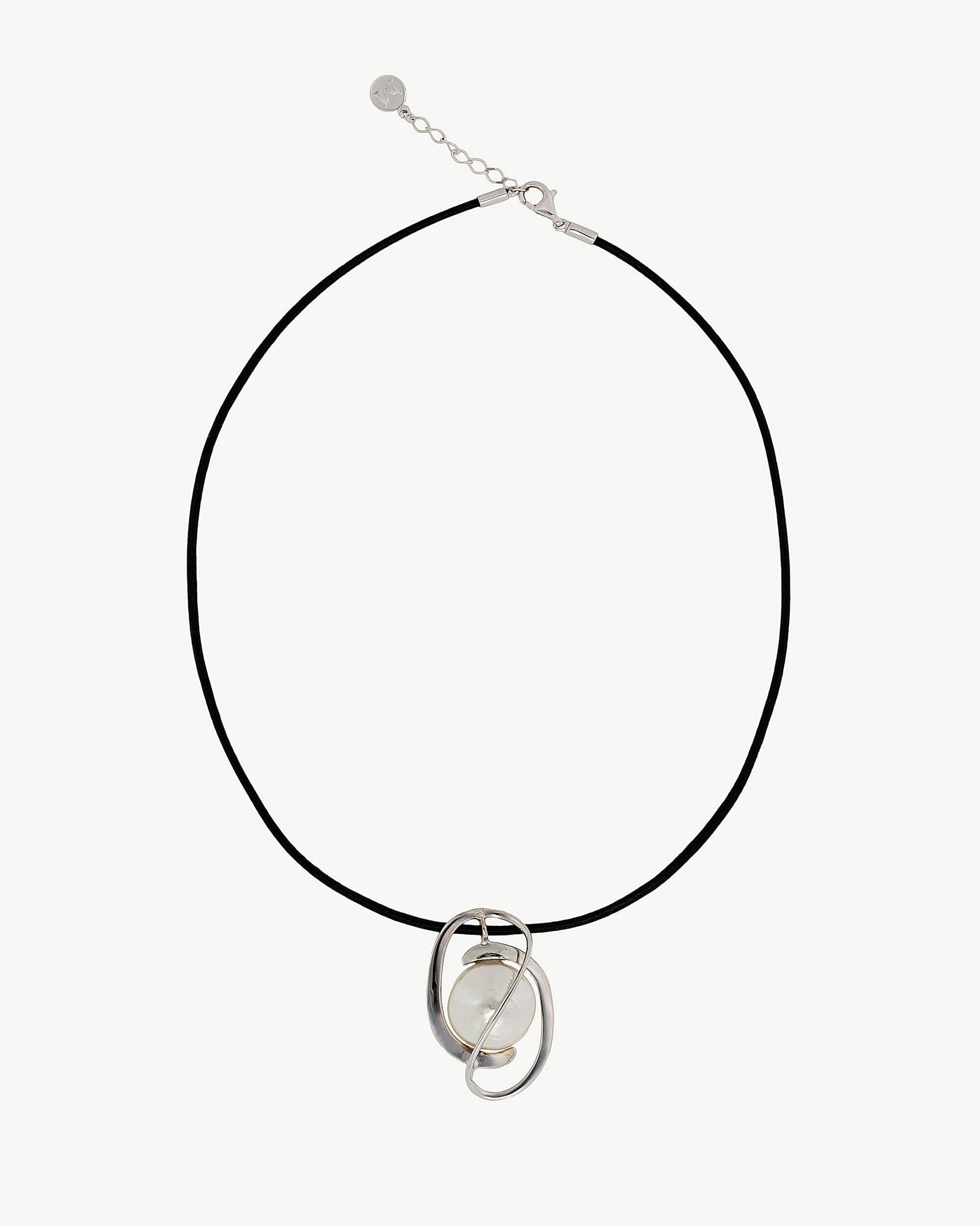Pendant with leather cord in rhodium-plated silver, 18mm white bombshell oval pearl. The name of a fantastic island is used to name a collection of plant jewelry in which the pearl is the center of gravity and protagonist.