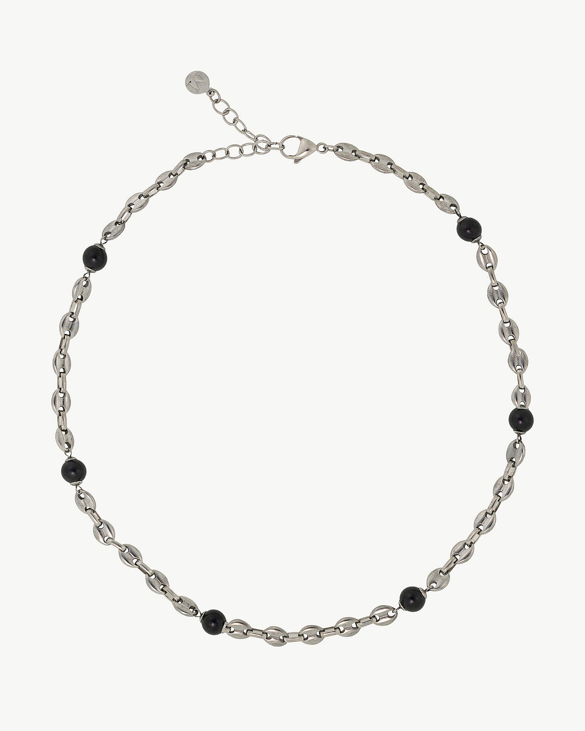 Chained steel necklace with 8mm black pearls and 49cm long. Sailor-inspired jewelry is our exclusive collection of jewelry for men inspired by the sea.