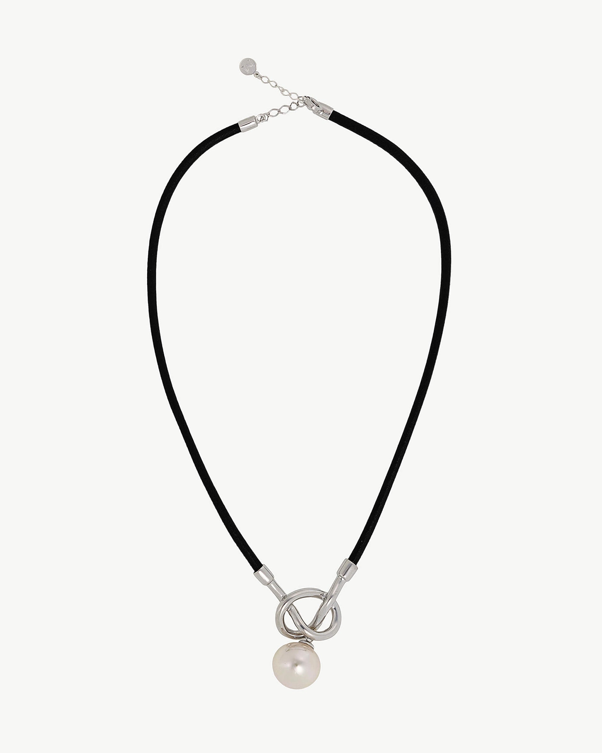3742cm black leather choker in rhodium-plated silver, 14mm white round pearl. It is an urban collection with a lot of character.