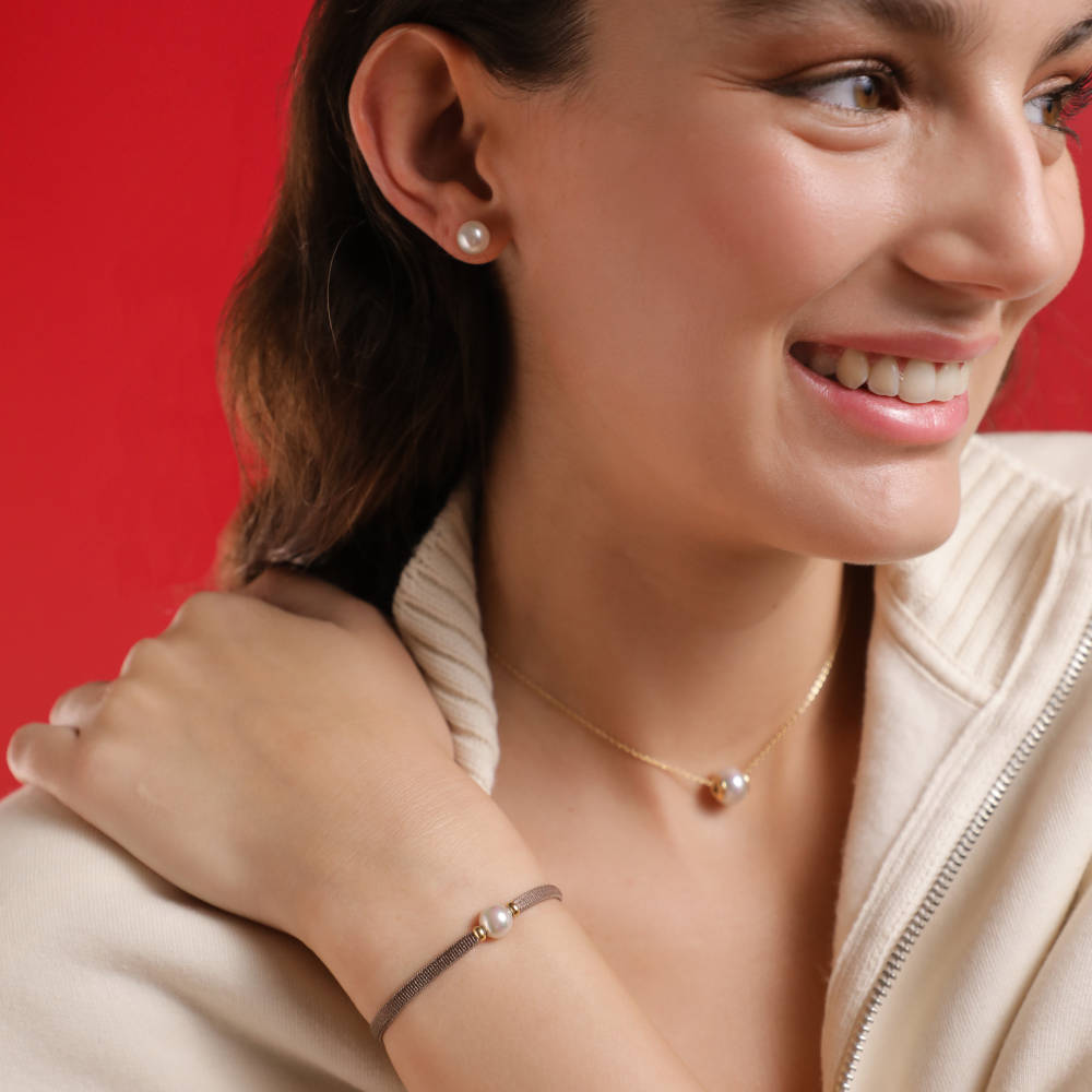 20 cm adjustable elastic bracelet in taupe color, 8 mm white round pearl. The collection is a tribute to strength and empowerment.20 cm adjustable elastic bracelet in taupe color, 8 mm white round pearl. The collection is a tribute to strength and empowerment.20 cm adjustable elastic bracelet in taupe color, 8 mm white round pearl. The collection is a tribute to strength and empowerment.