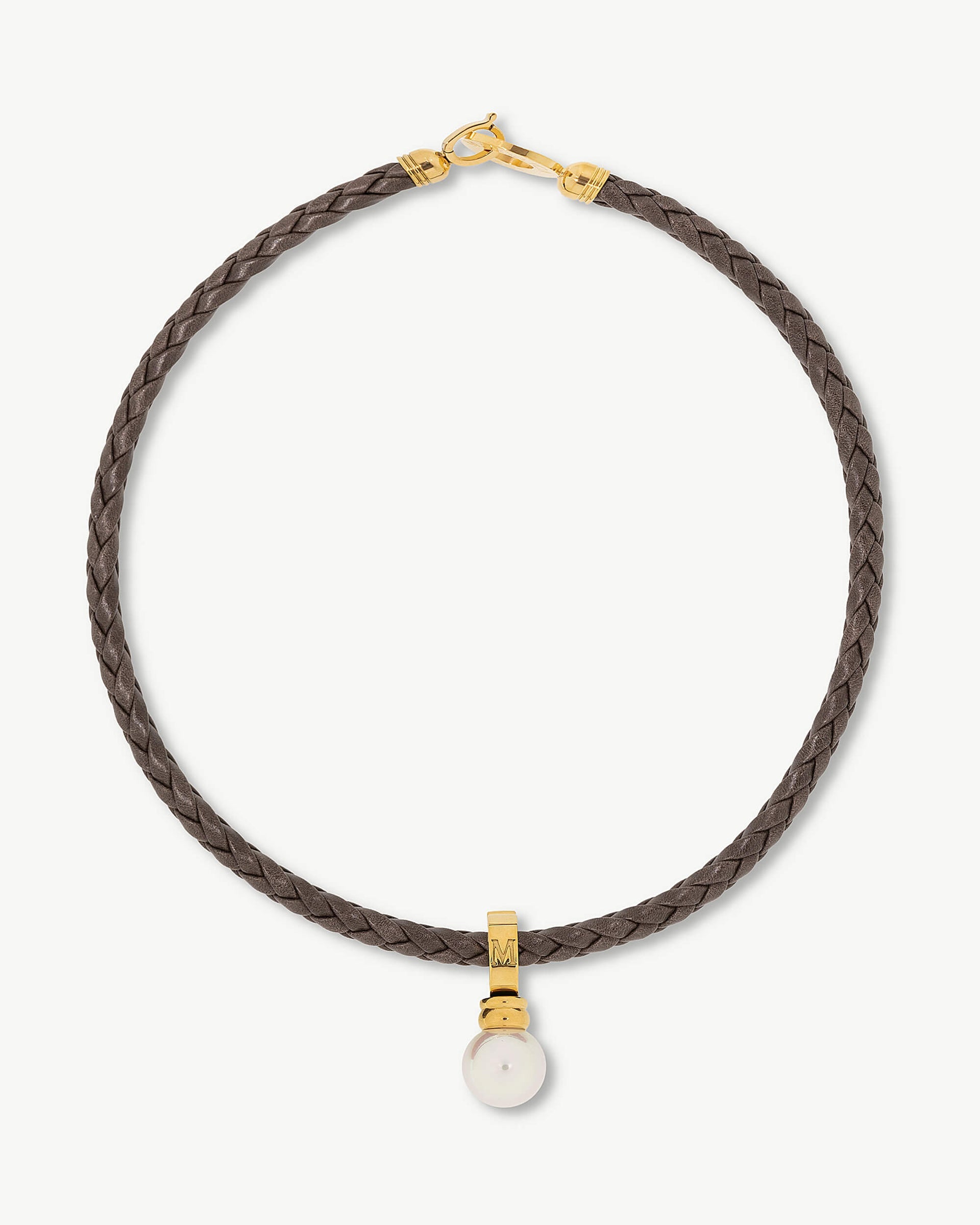Necklace in gold steel and brown braided leather with 14mm white round pearl. Casual, high-quality pieces for the most eclectic.BRAID is the perfect choice for those looking for versatile and modern accessories, ideal as a gift or to complement a casual style.Necklace in gold steel and brown braided leather with 14mm white round pearl. Casual, high-quality pieces for the most eclectic. BRAID is the perfect choice for those looking for versatile and modern accessories, ideal as a gift or to complement a casual style.Necklace in gold steel and brown braided leather with 14mm white round pearl. Casual, high-quality pieces for the most eclectic. BRAID is the perfect choice for those looking for versatile and modern accessories, ideal as a gift or to complement a casual style.