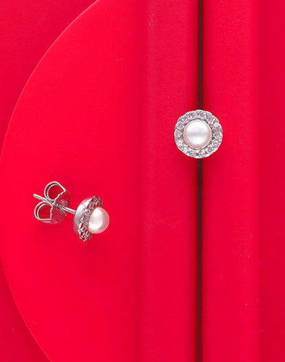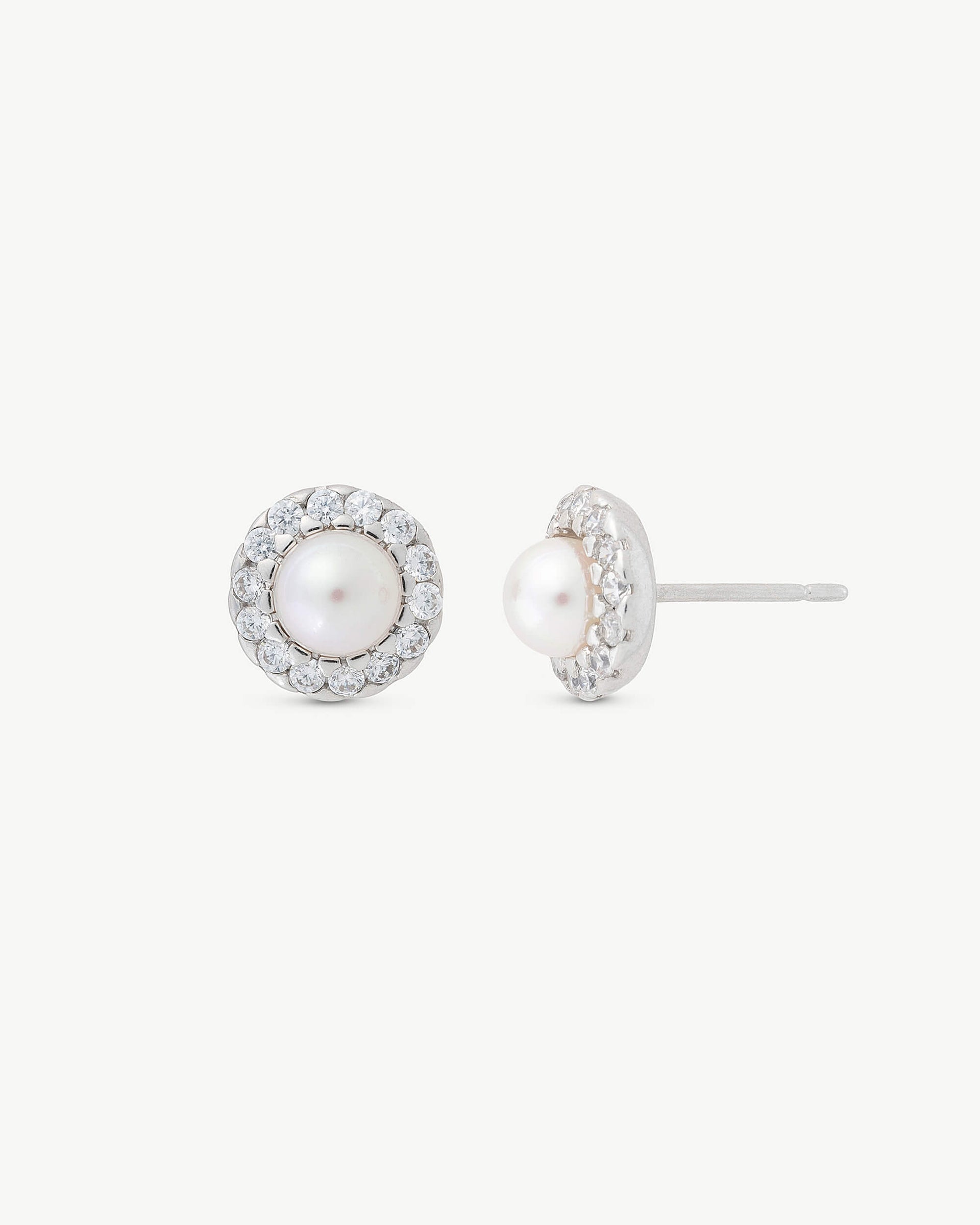 Short spike earrings in rhodium-plated silver, 5mm white round pearls and zircons. Pearls and Zircons to shine at any event or occasion.