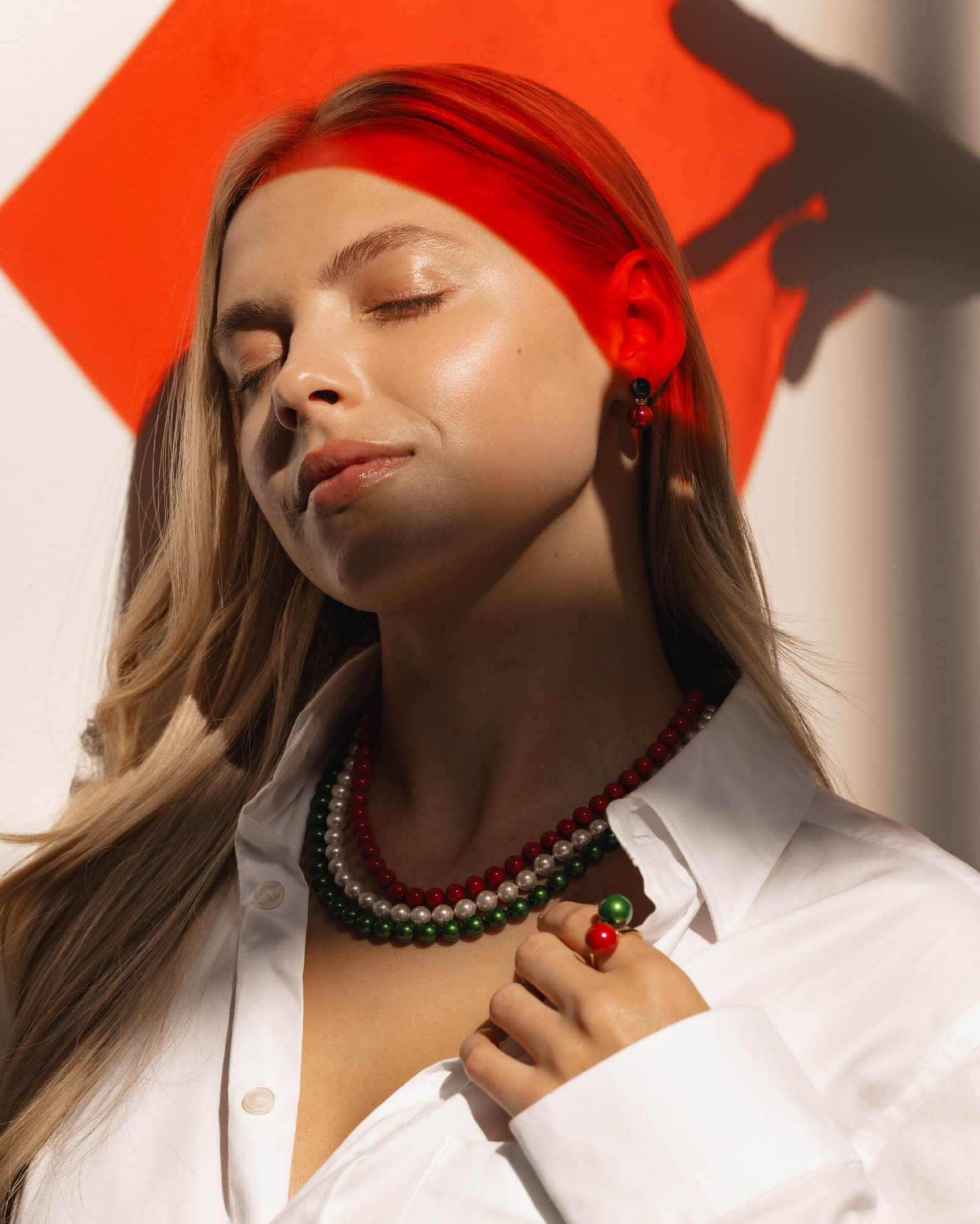 Open ring in golden silver with 12mm round red and green pearls.Combining pearls with each other in a particular way inspired by the 50s is fashionable.Open ring in golden silver with 12mm round red and green pearls. Combining pearls with each other in a particular way inspired by the 50s is fashionable.Open ring in golden silver with 12mm round red and green pearls. Combining pearls with each other in a particular way inspired by the 50s is fashionable.