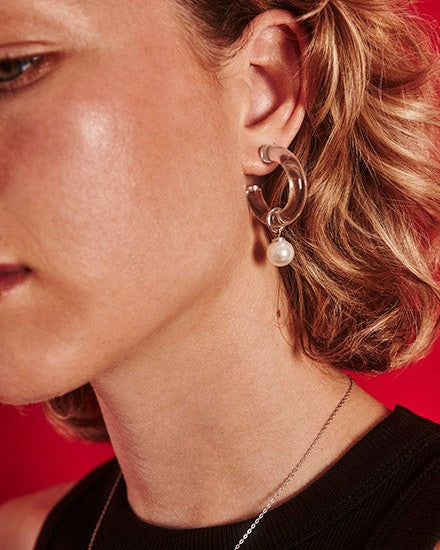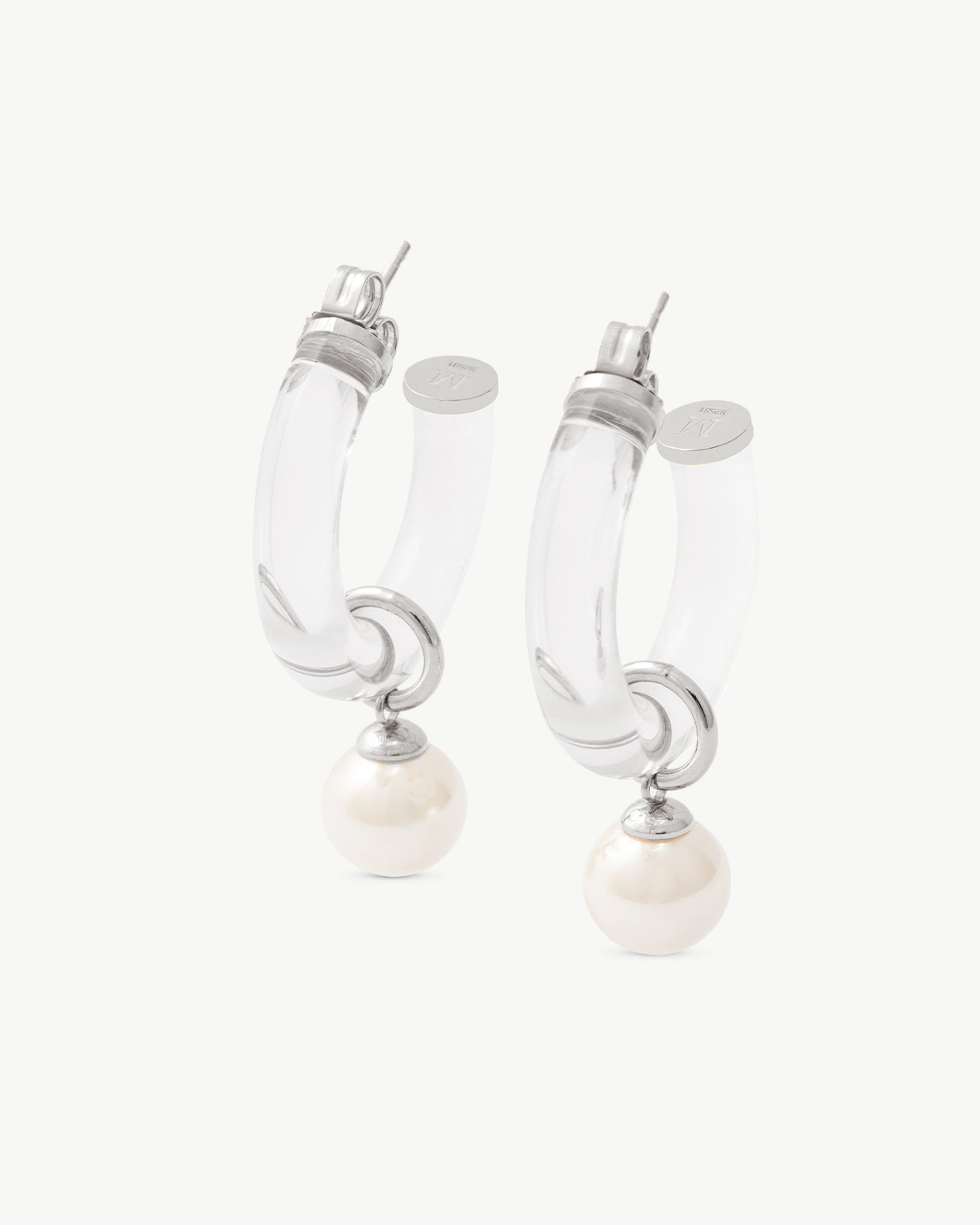 Hoop earrings in crystal and rhodium-plated silver with 10mm round white pearl and spike closure. It is a collection in which the powerful light and unstoppable force of the moon has become a jewel.Hoop earrings in crystal and rhodium-plated silver with 10mm round white pearl and spike closure. It is a collection in which the powerful light and unstoppable force of the moon has become a jewel.Hoop earrings in crystal and rhodium-plated silver with 10mm round white pearl and spike closure. It is a collection in which the powerful light and unstoppable force of the moon has become a jewel.