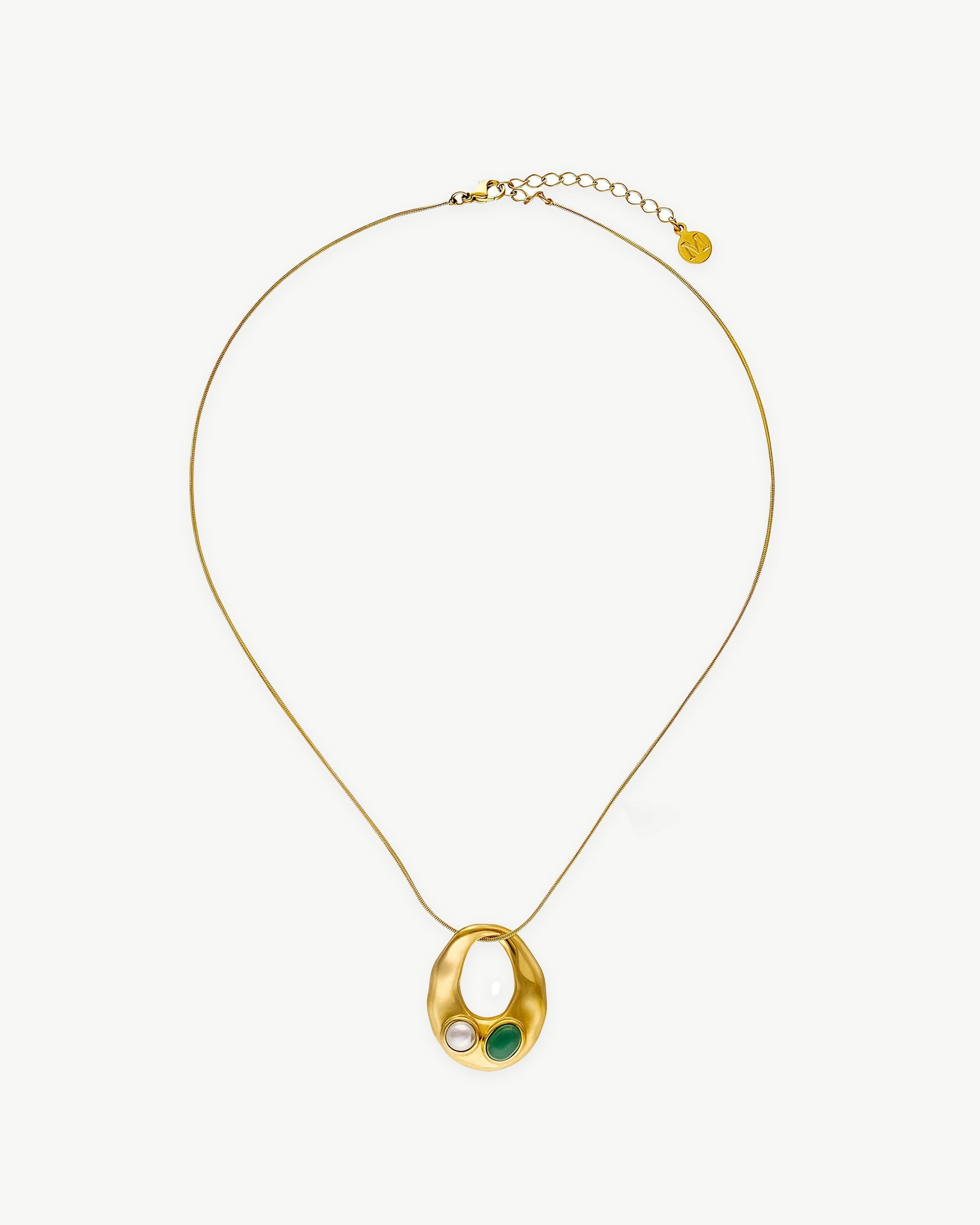 Pendant with gold-tone steel chain, white half-ball pearl and green agate. Design meets strength.