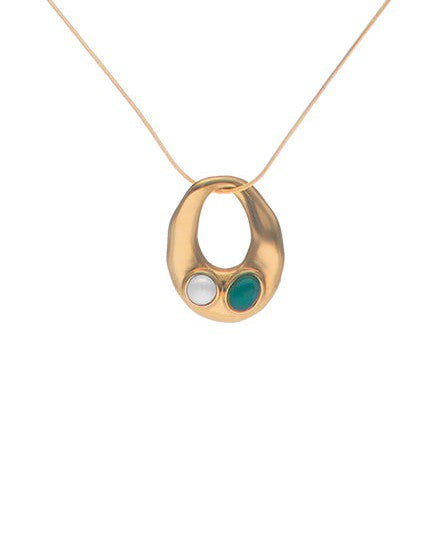 Pendant with gold-tone steel chain, white half-ball pearl and green agate. Design meets strength.Pendant with gold-tone steel chain, white half-ball pearl and green agate. Design meets strength.Pendant with gold-tone steel chain, white half-ball pearl and green agate. Design meets strength.