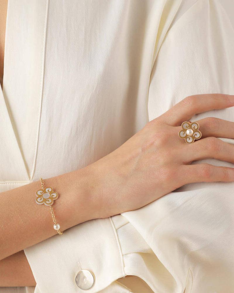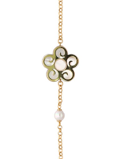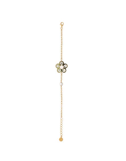Chain bracelet with linked links, 1518 cm long in gold-plated silver, with a flower linked on the chain and with the detail of the 6 mm round white pearl.A collection and jewelry inspired by the beauty and light of flowers.Chain bracelet with linked links, 1518 cm long in gold-plated silver, with a flower linked on the chain and with the detail of the 6 mm round white pearl. A collection and jewelry inspired by the beauty and light of flowers.Chain bracelet with linked links, 1518 cm long in gold-plated silver, with a flower linked on the chain and with the detail of the 6 mm round white pearl. A collection and jewelry inspired by the beauty and light of flowers.