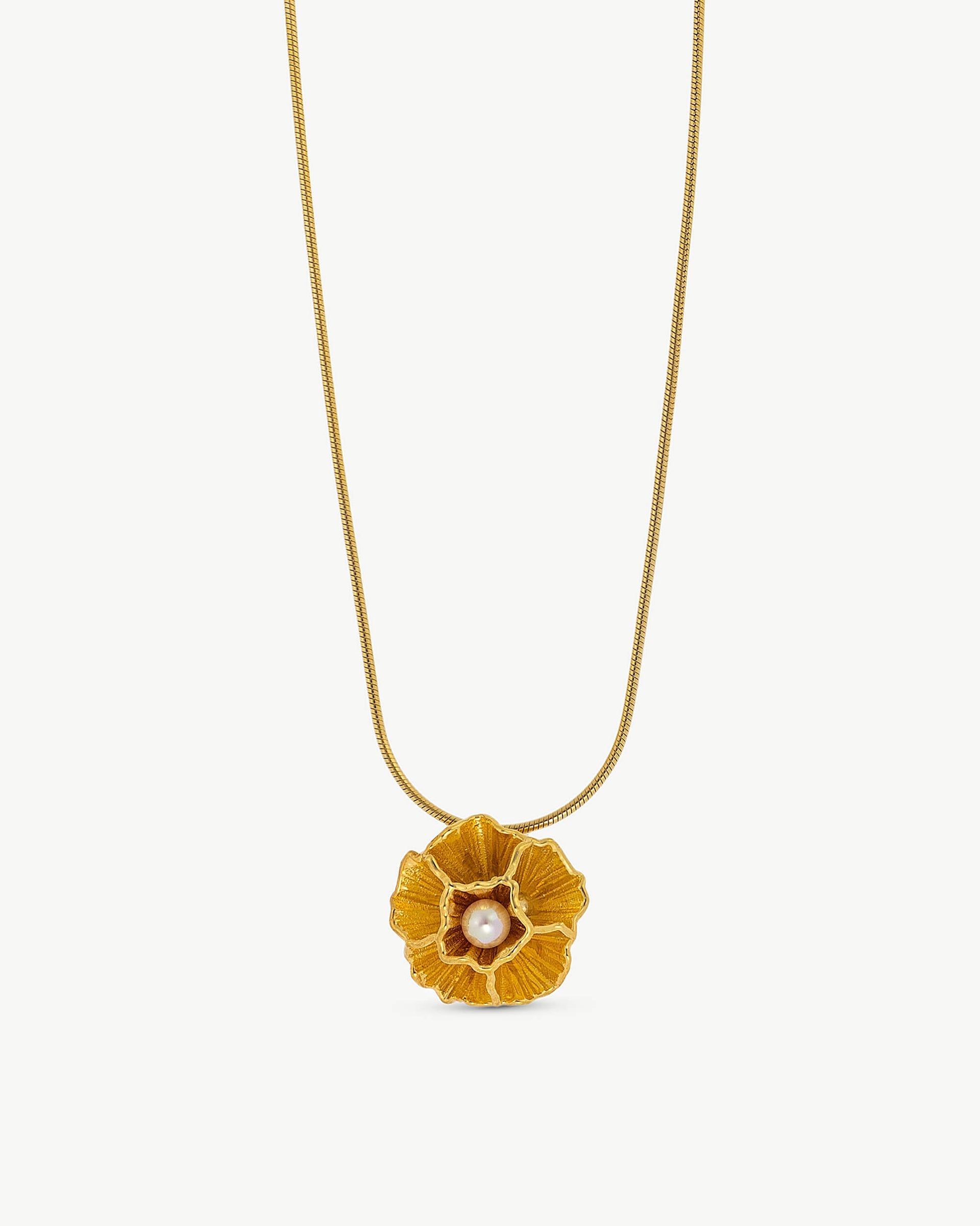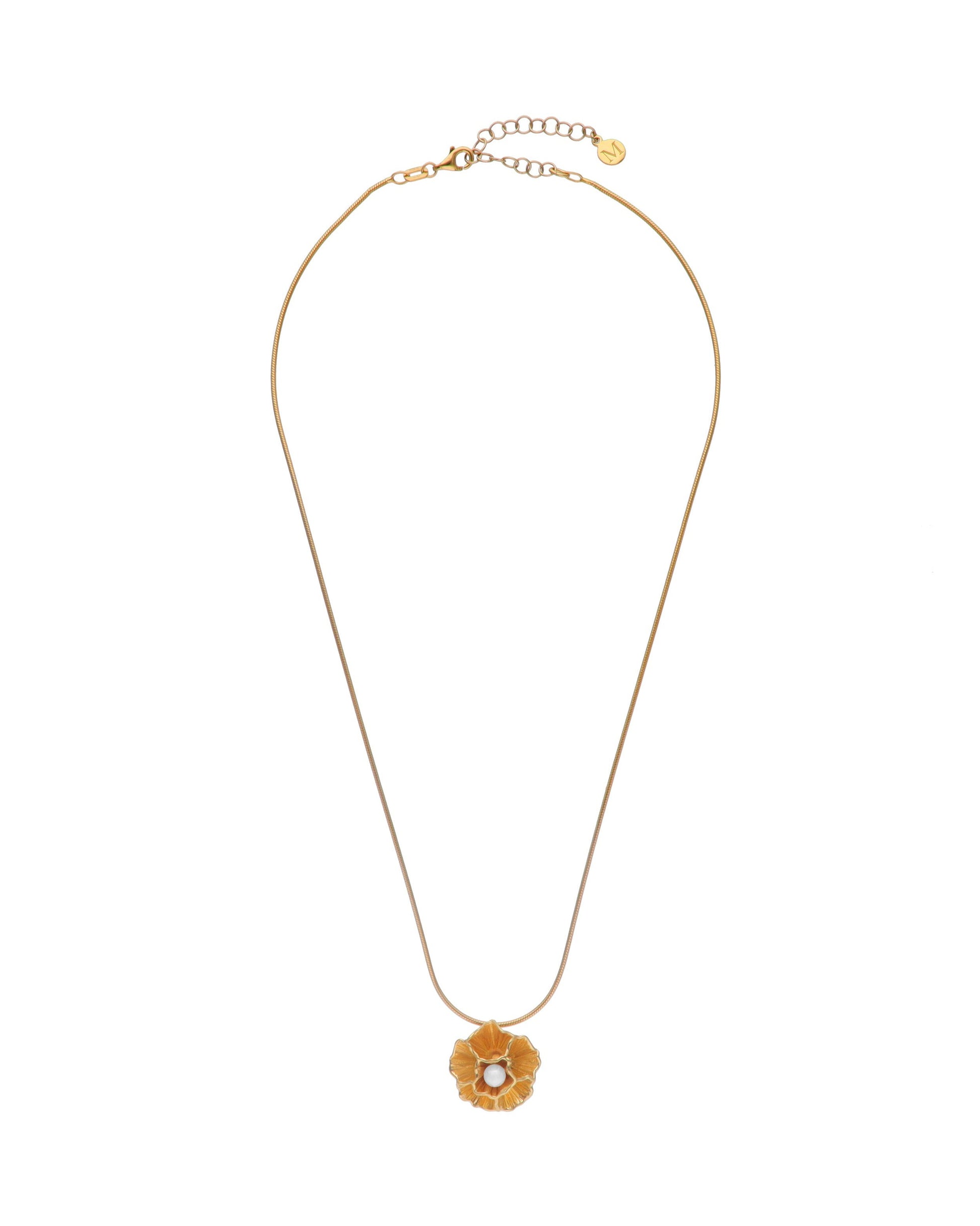 Pendant with chain in silver with gold plating. 8mm white round pearl. 42cm long. Jewelry full of style Welcome to the freshness and elegance of our new collection, inspired by the south of Spain and its famous carnations! And the collection is like a VIP pass to a garden full of style, where carnations become the stars of the show.