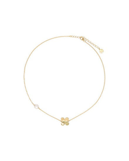 Short 4045 cm necklace in golden silver, 7mm round white pearl and mother of pearl. Fortune and magic in each of the lines of the collection.