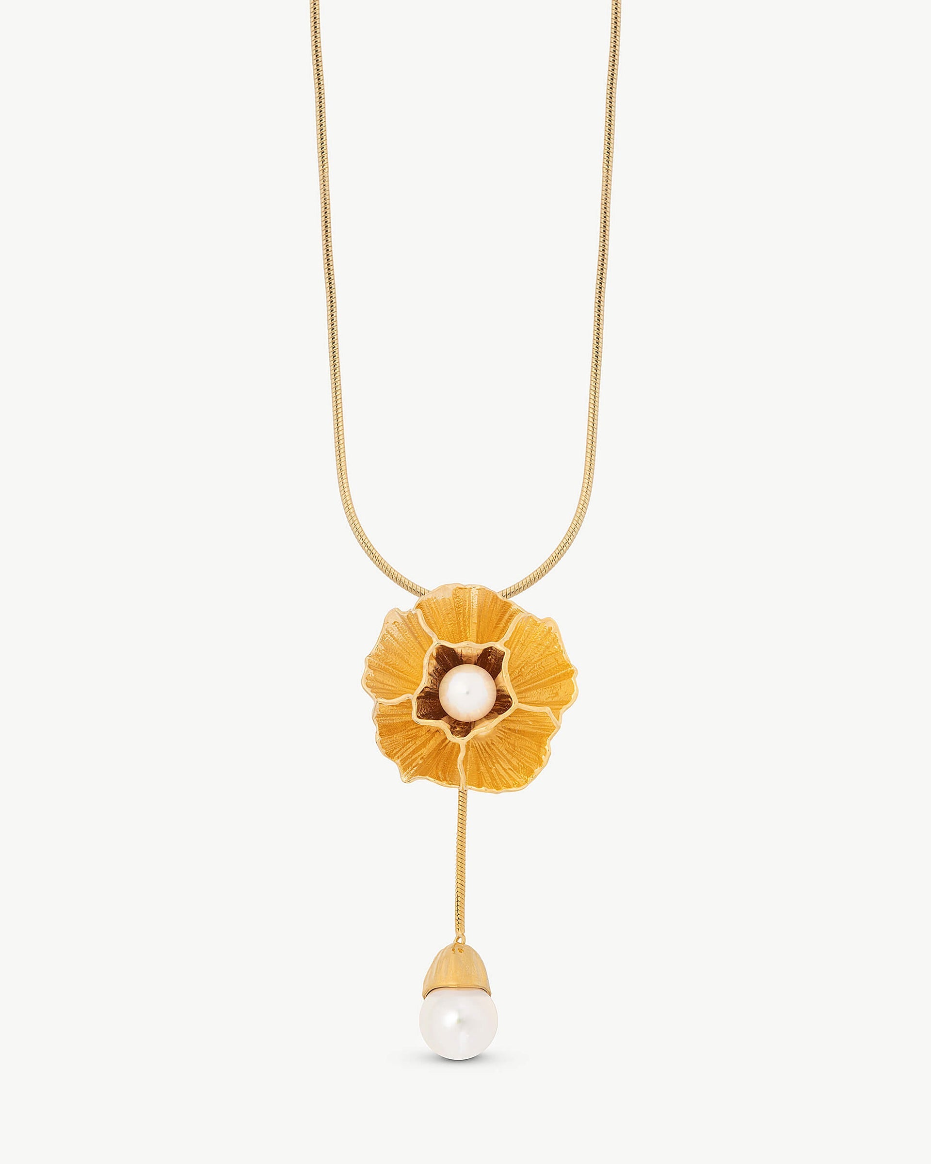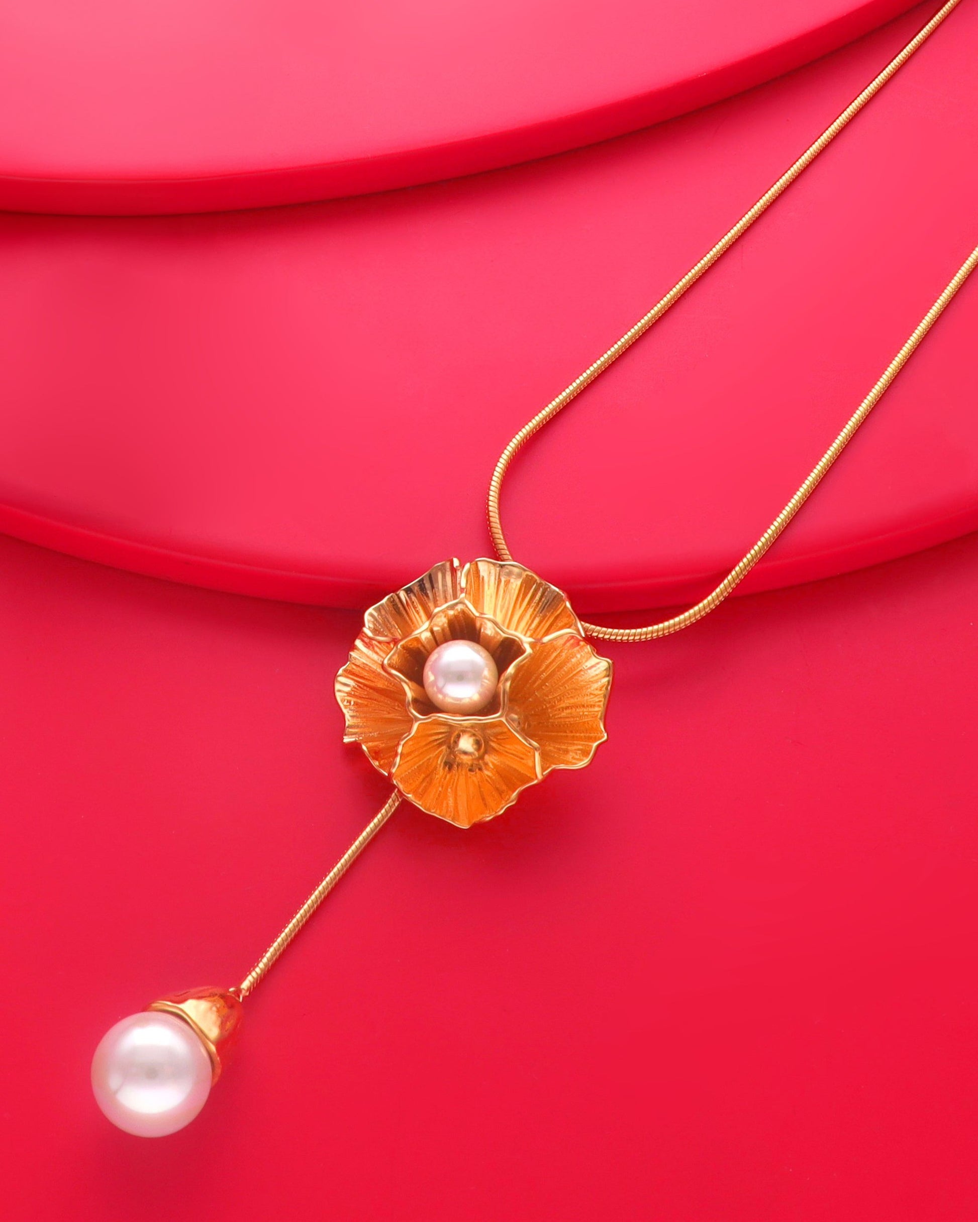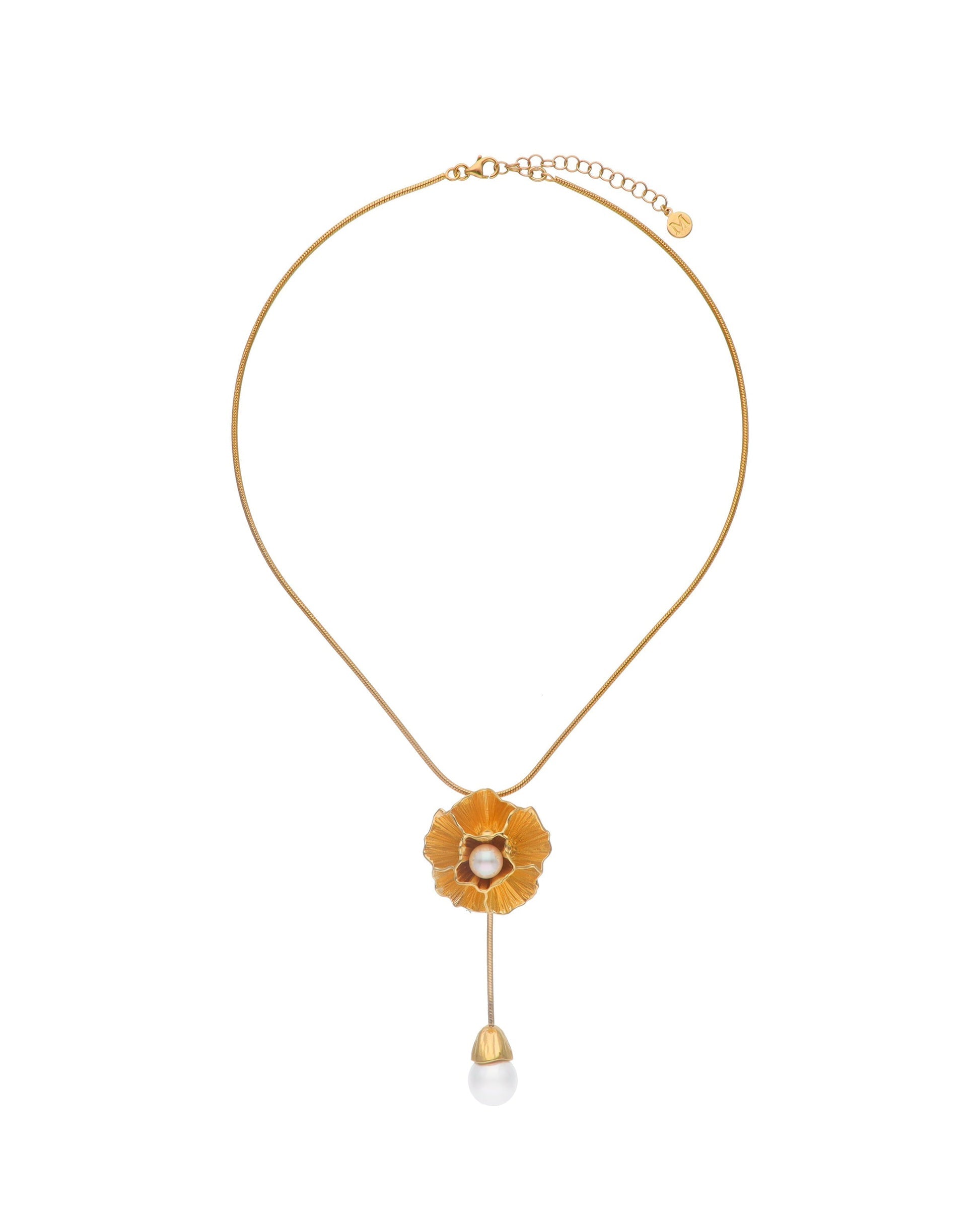Pendant with chain in silver with gold plating. 8mm white round pearl and 12mm white pear pearl. 42cm long. Jewelry full of style Welcome to the freshness and elegance of our new collection, inspired by the south of Spain and its famous carnations! And the collection is like a VIP pass to a garden full of style, where carnations become the stars of the show.