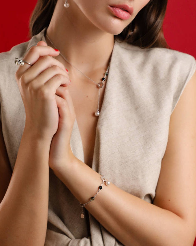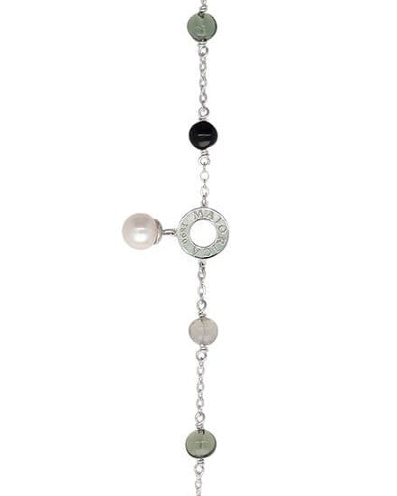 16.519.5 cm chain bracelet in rhodium-plated silver, 7 mm white round pearls and black Murano crystals. The collection shares its name with one of the Mallorcan towns with the most craftsmanship on the island.