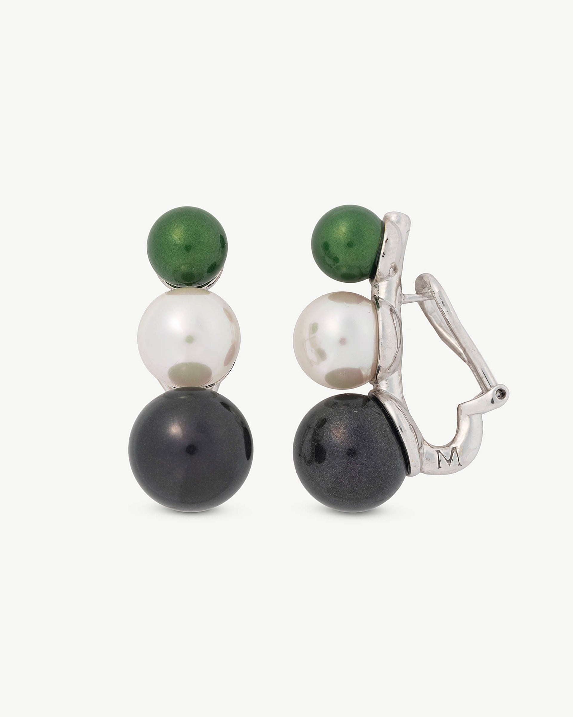 Rhodium-plated silver earring with omega closure. Green, white and black triple round pearl measuring 8, 10 and 12mm. Combining pearls with each other in a particular way inspired by the 50s is fashionable.Rhodium-plated silver earring with omega closure. Green, white and black triple round pearl measuring 8, 10 and 12mm. Combining pearls with each other in a particular way inspired by the 50s is fashionable.Rhodium-plated silver earring with omega closure. Green, white and black triple round pearl measuring 8, 10 and 12mm. Combining pearls with each other in a particular way inspired by the 50s is fashionable.