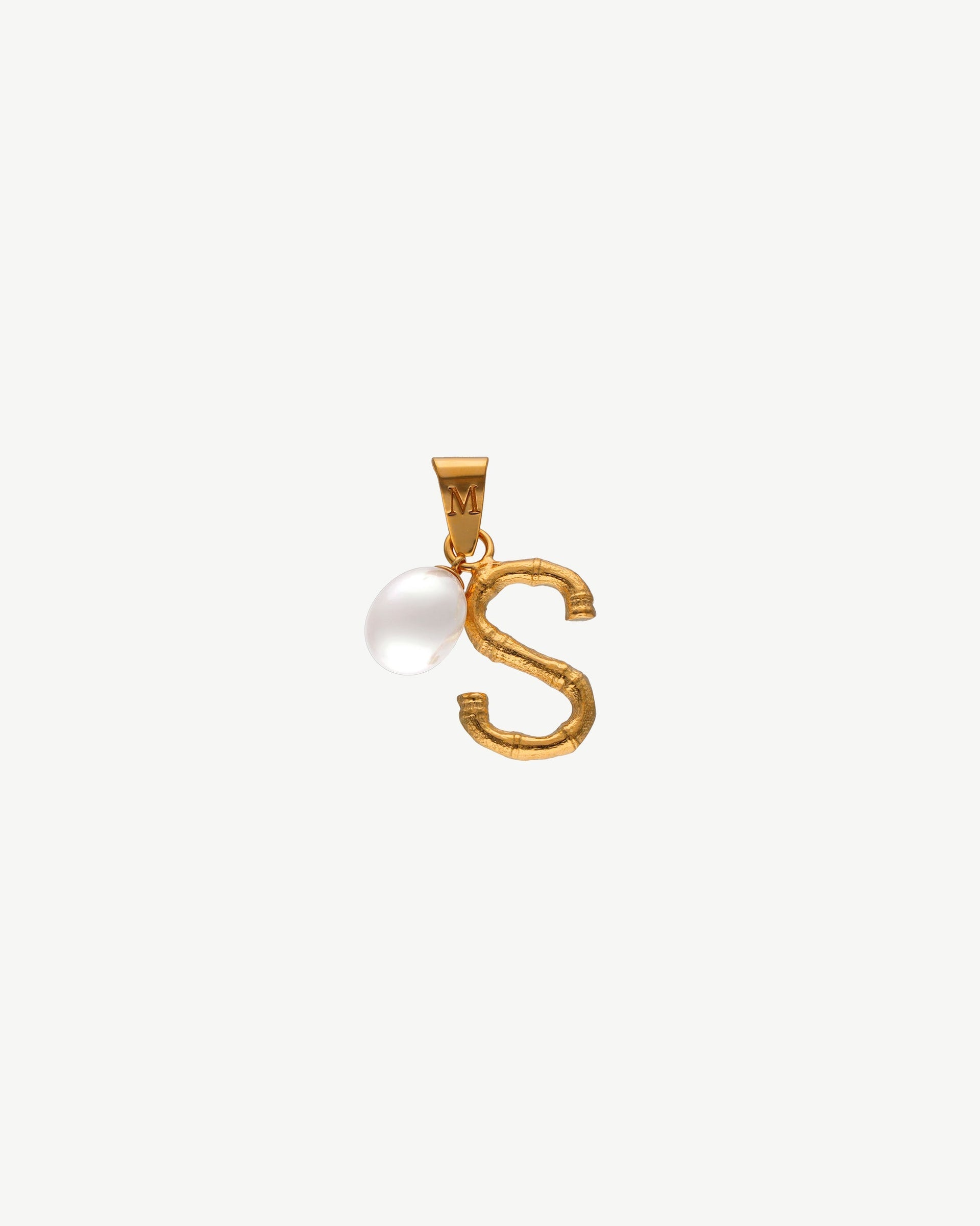 Initial charm S in golden silver with White pearl. The Bamboo capsule represents the exotic jungle, the tall trees with intertwined branches that form a spectacular canopy.Initial charm S in golden silver with White pearl. The Bamboo capsule represents the exotic jungle, the tall trees with intertwined branches that form a spectacular canopy.Initial charm S in golden silver with White pearl. The Bamboo capsule represents the exotic jungle, the tall trees with intertwined branches that form a spectacular canopy.