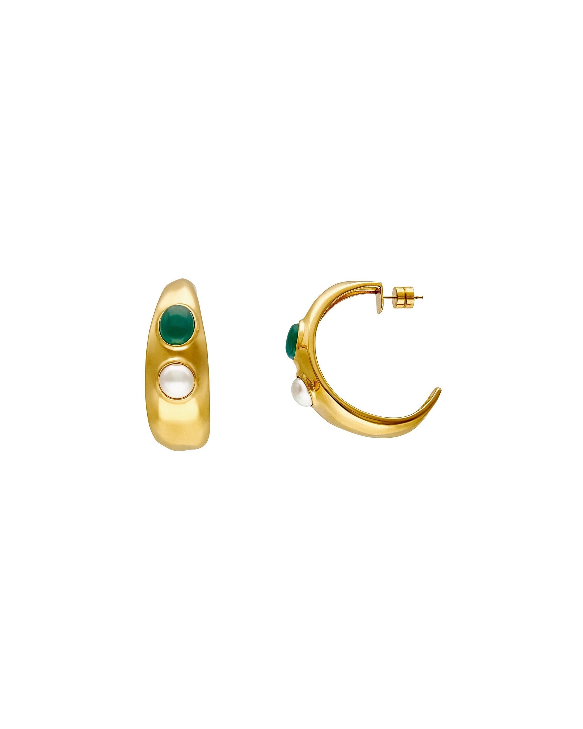 Hoop earrings in gold steel with white half-ball pearl and green agate. Design meets strength.