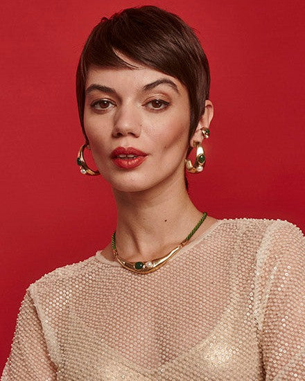 Hoop earrings in gold steel with white half-ball pearl and green agate. Design meets strength.Hoop earrings in gold steel with white half-ball pearl and green agate. Design meets strength.Hoop earrings in gold steel with white half-ball pearl and green agate. Design meets strength.