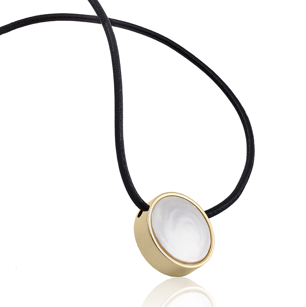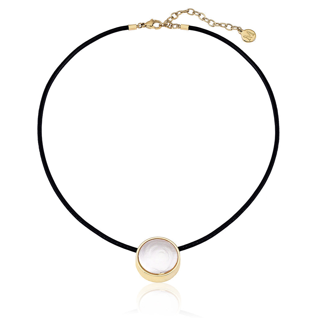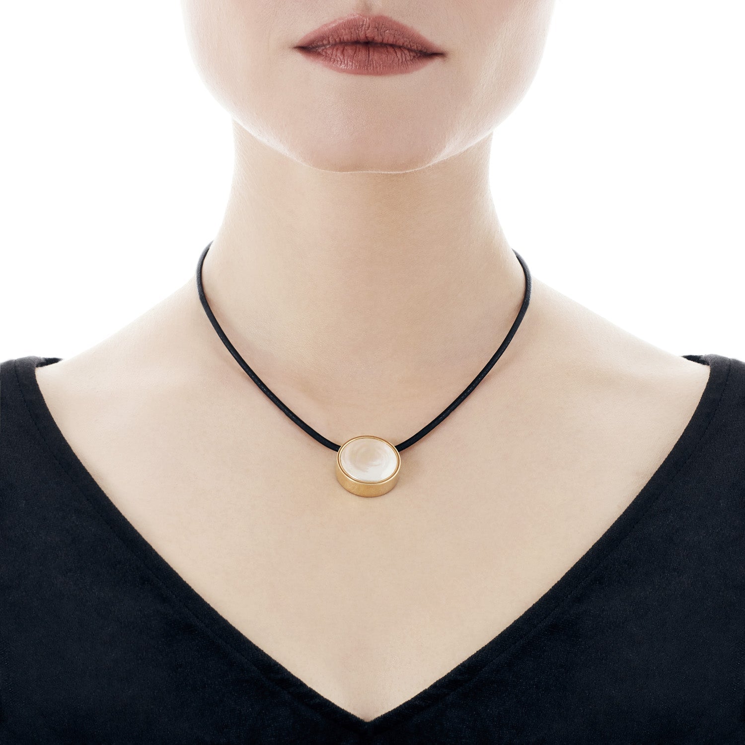 Short 4046cm necklace in gold steel and black leather, with 20mm flat white pearl.