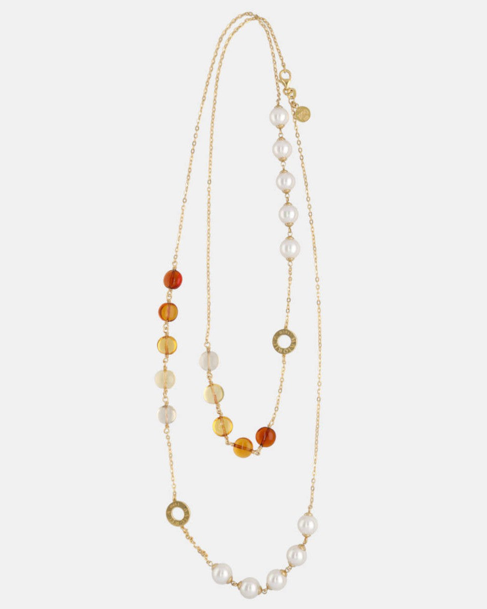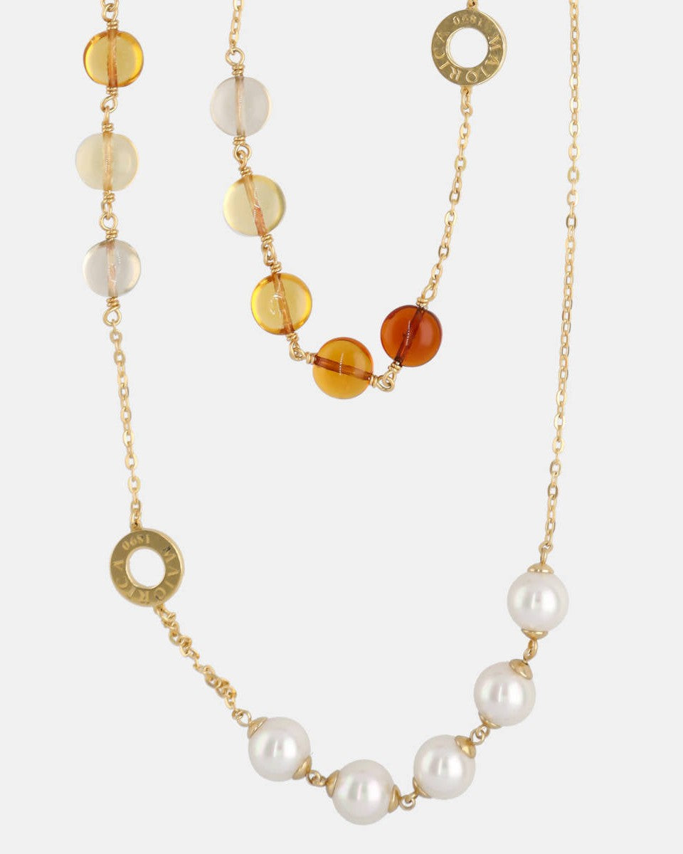 90 cm long chain necklace in golden silver, 8 mm round white pearls and amber Murano crystals. The collection shares its name with one of the Mallorcan towns with the most craftsmanship on the island.