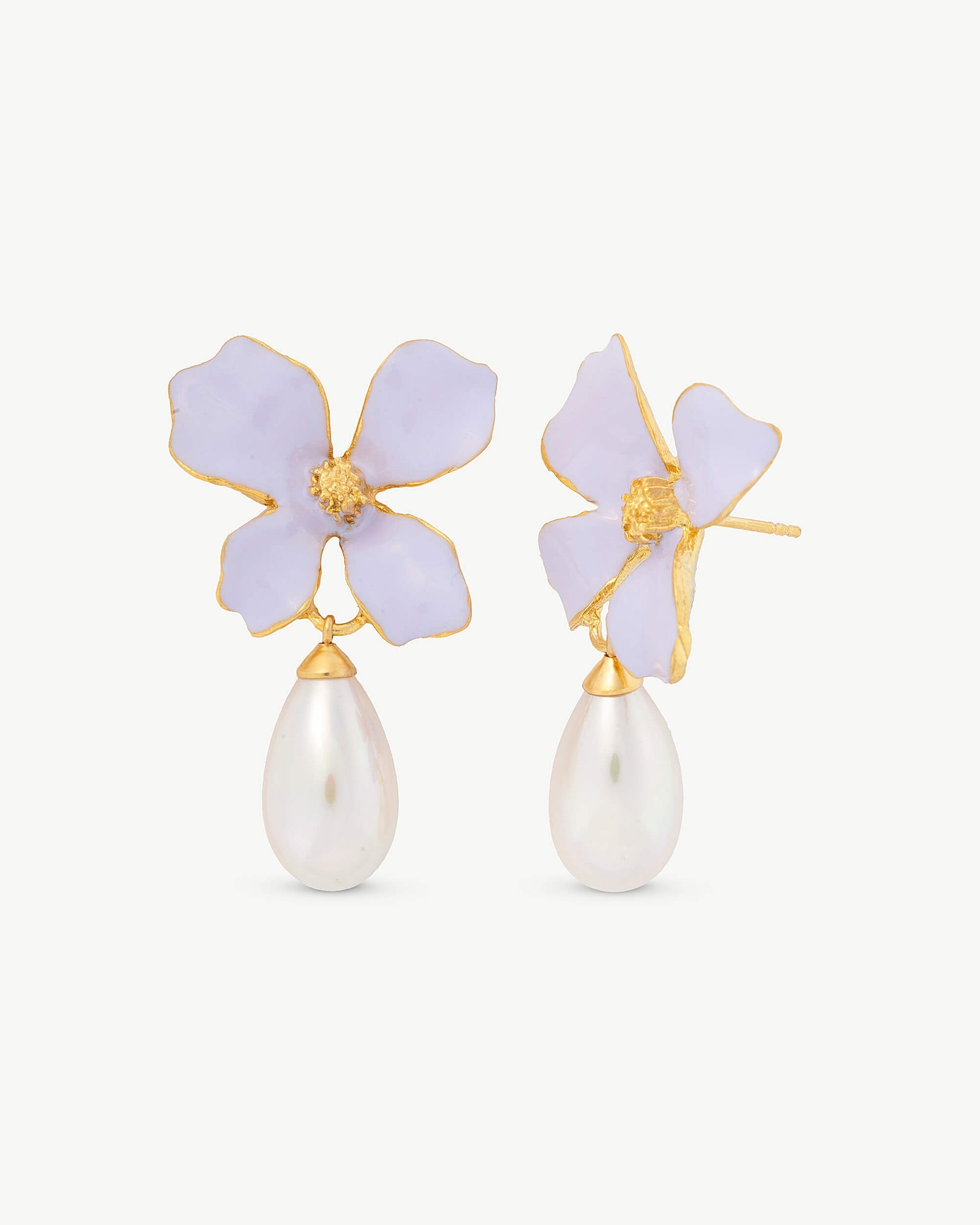 Golden silver spike earrings with lilac flower and 7 x 10 mm white pear pearl. The enameled flowers on golden silver shine for day and night occasions.The collection brings with it an explosion of color inspired by the beauty of flowers that give life to maximalist jewelry.Golden silver spike earrings with lilac flower and 7 x 10 mm white pear pearl. The enameled flowers on golden silver shine for day and night occasions. The collection brings with it an explosion of color inspired by the beauty of flowers that give life to maximalist jewelry.Golden silver spike earrings with lilac flower and 7 x 10 mm white pear pearl. The enameled flowers on golden silver shine for day and night occasions. The collection brings with it an explosion of color inspired by the beauty of flowers that give life to maximalist jewelry.