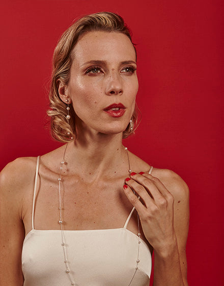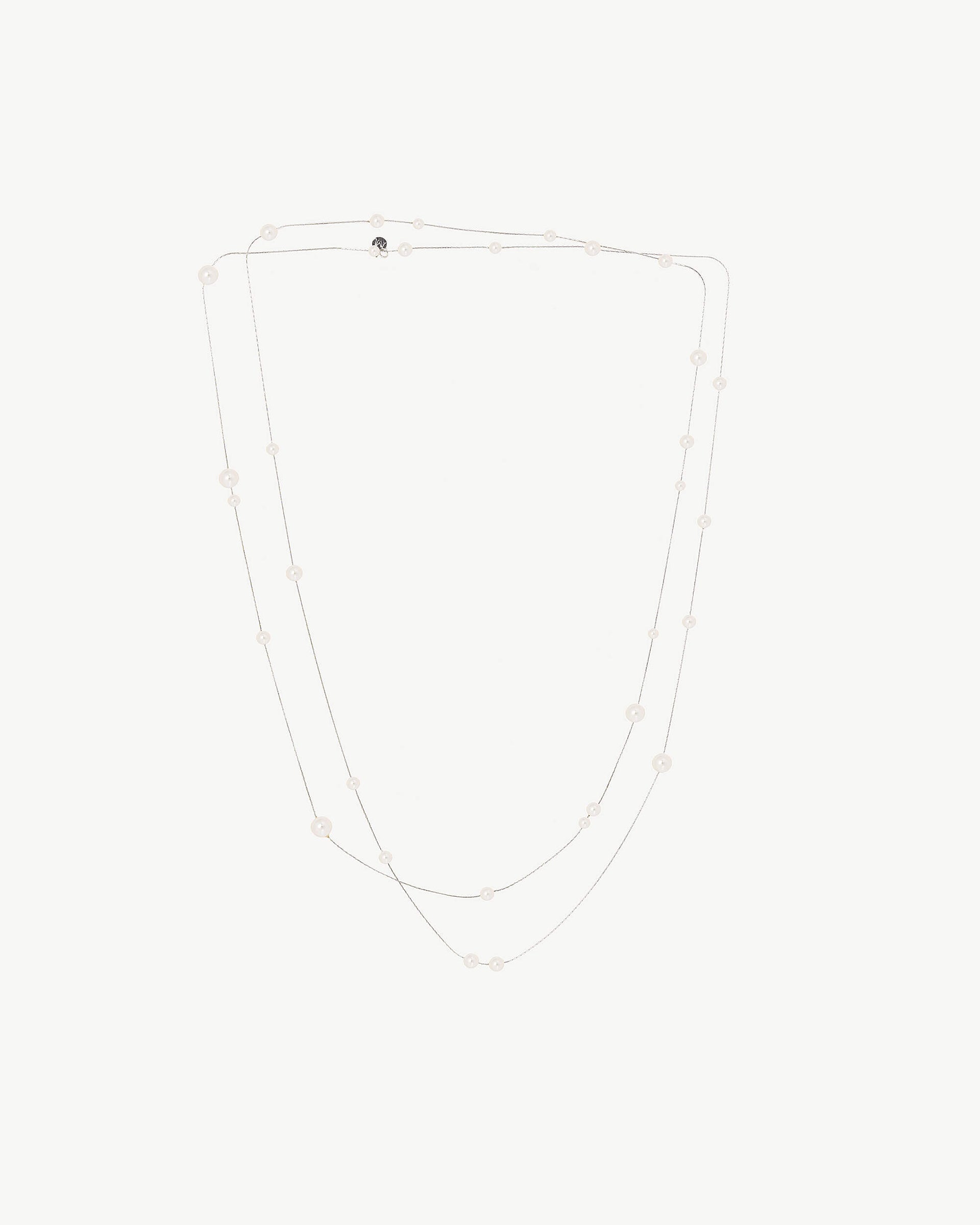 Long fine chain necklace made of silver, with 4,5,6,7 and 8 mm round white pearls and chain length 90cm.Jewelry for special events, ideal accessories to wear on your wedding day.Long fine chain necklace made of silver, with 4,5,6,7 and 8 mm round white pearls and chain length 90cm. Jewelry for special events, ideal accessories to wear on your wedding day.Long fine chain necklace made of silver, with 4,5,6,7 and 8 mm round white pearls and chain length 90cm. Jewelry for special events, ideal accessories to wear on your wedding day.