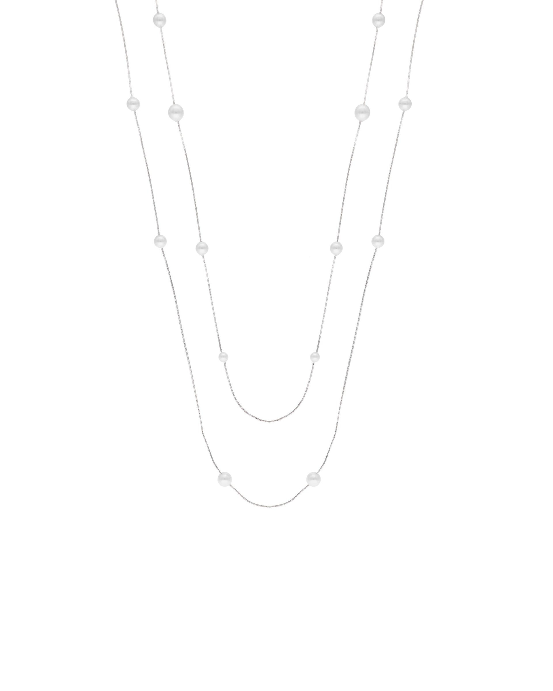 Long chain necklace in rhodium-plated silver and white round pearls of 4,5,6,7 and 8 mm and length of 160cm.