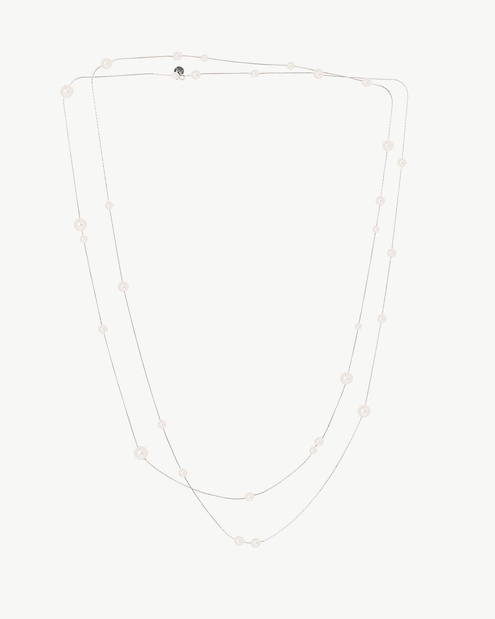 Long chain necklace in rhodium-plated silver and white round pearls of 4,5,6,7 and 8 mm and length of 160cm.Jewelry for special events, ideal accessories to wear on your wedding day.Long chain necklace in rhodium-plated silver and white round pearls of 4,5,6,7 and 8 mm and length of 160cm. Jewelry for special events, ideal accessories to wear on your wedding day.Long chain necklace in rhodium-plated silver and white round pearls of 4,5,6,7 and 8 mm and length of 160cm. Jewelry for special events, ideal accessories to wear on your wedding day.