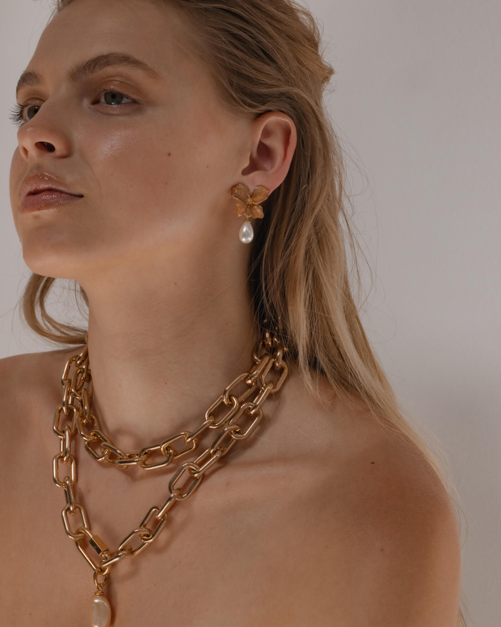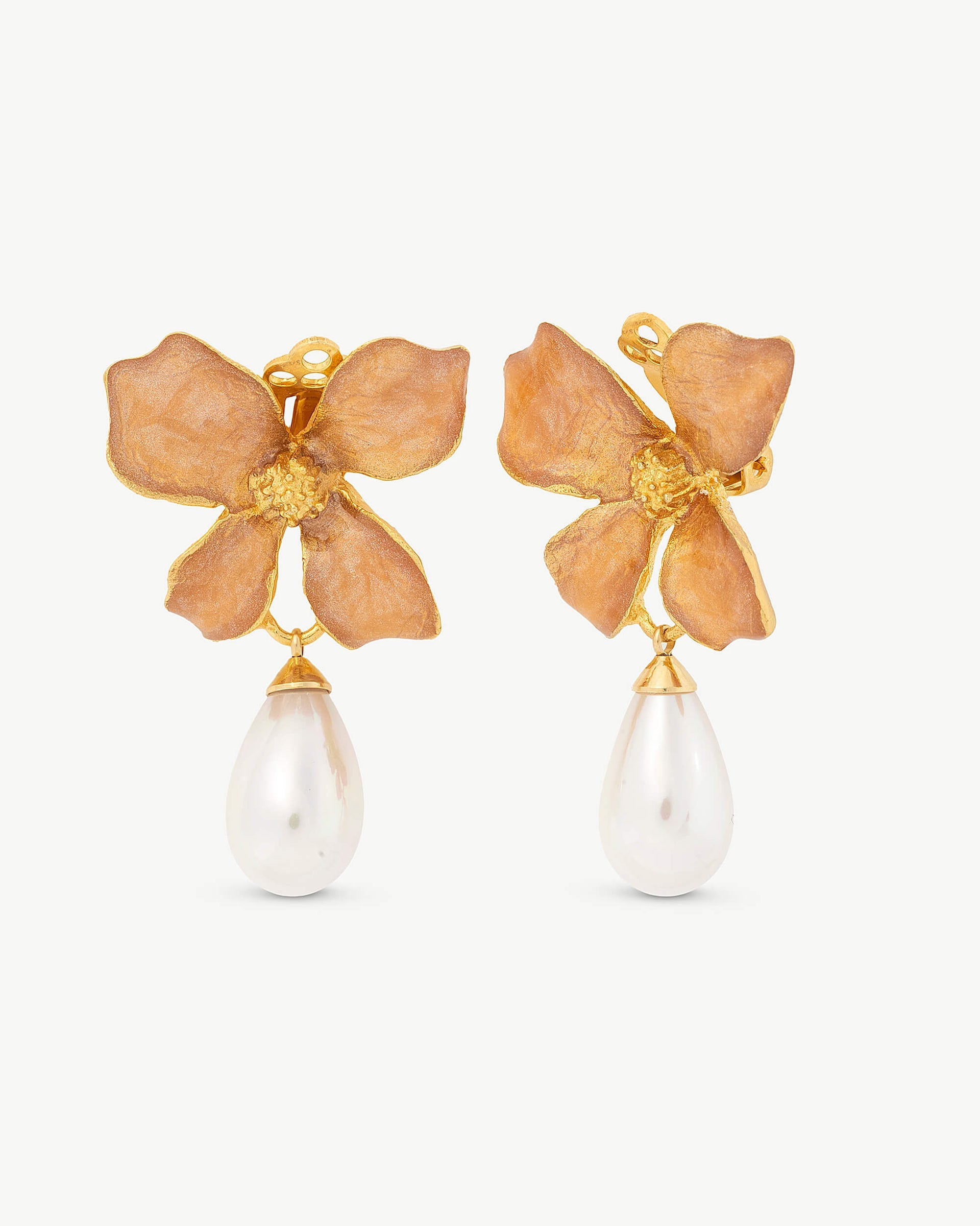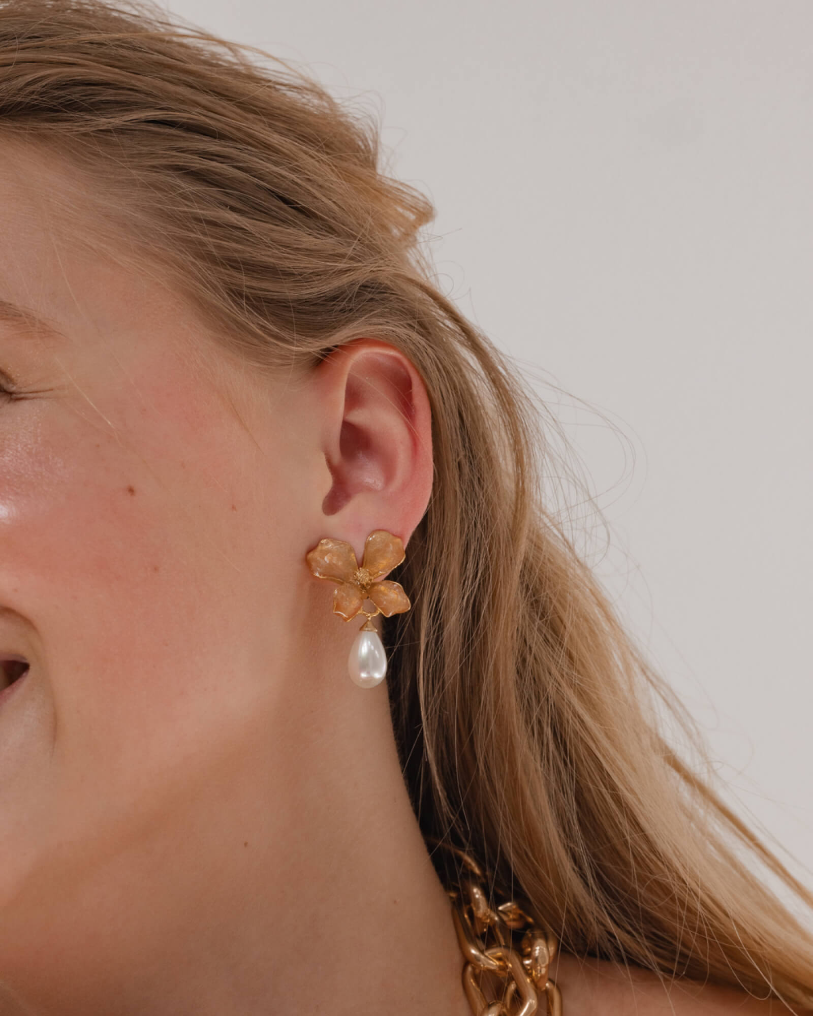 Earrings with omega closure in golden silver with ocher flower and 7 x 10 mm white pear pearl. The enameled flowers on 18k gold-plated silver shine for day and night occasions.The collection brings with it an explosion of color inspired by the beauty of flowers that give life to maximalist jewelry.Earrings with omega closure in golden silver with ocher flower and 7 x 10 mm white pear pearl. The enameled flowers on 18k gold-plated silver shine for day and night occasions. The collection brings with it an explosion of color inspired by the beauty of flowers that give life to maximalist jewelry.Earrings with omega closure in golden silver with ocher flower and 7 x 10 mm white pear pearl. The enameled flowers on 18k gold-plated silver shine for day and night occasions. The collection brings with it an explosion of color inspired by the beauty of flowers that give life to maximalist jewelry.