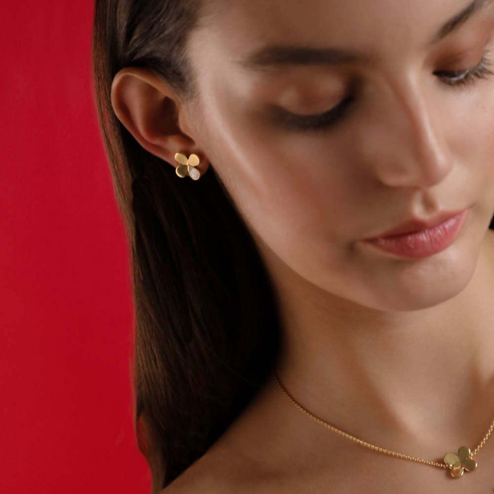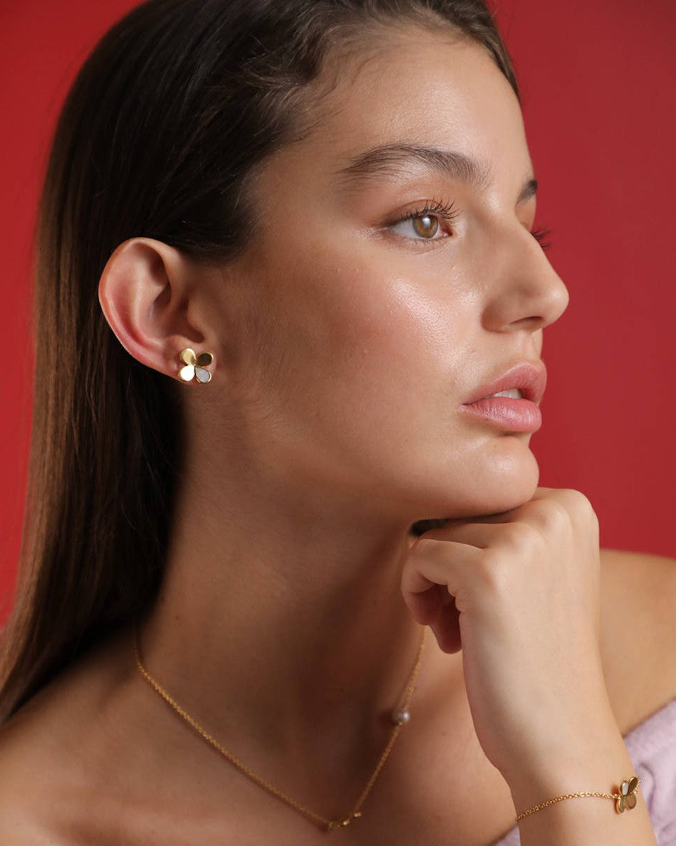 Short spike earrings in golden silver with mother of pearl. Fortune and magic in each of the lines of the collection.