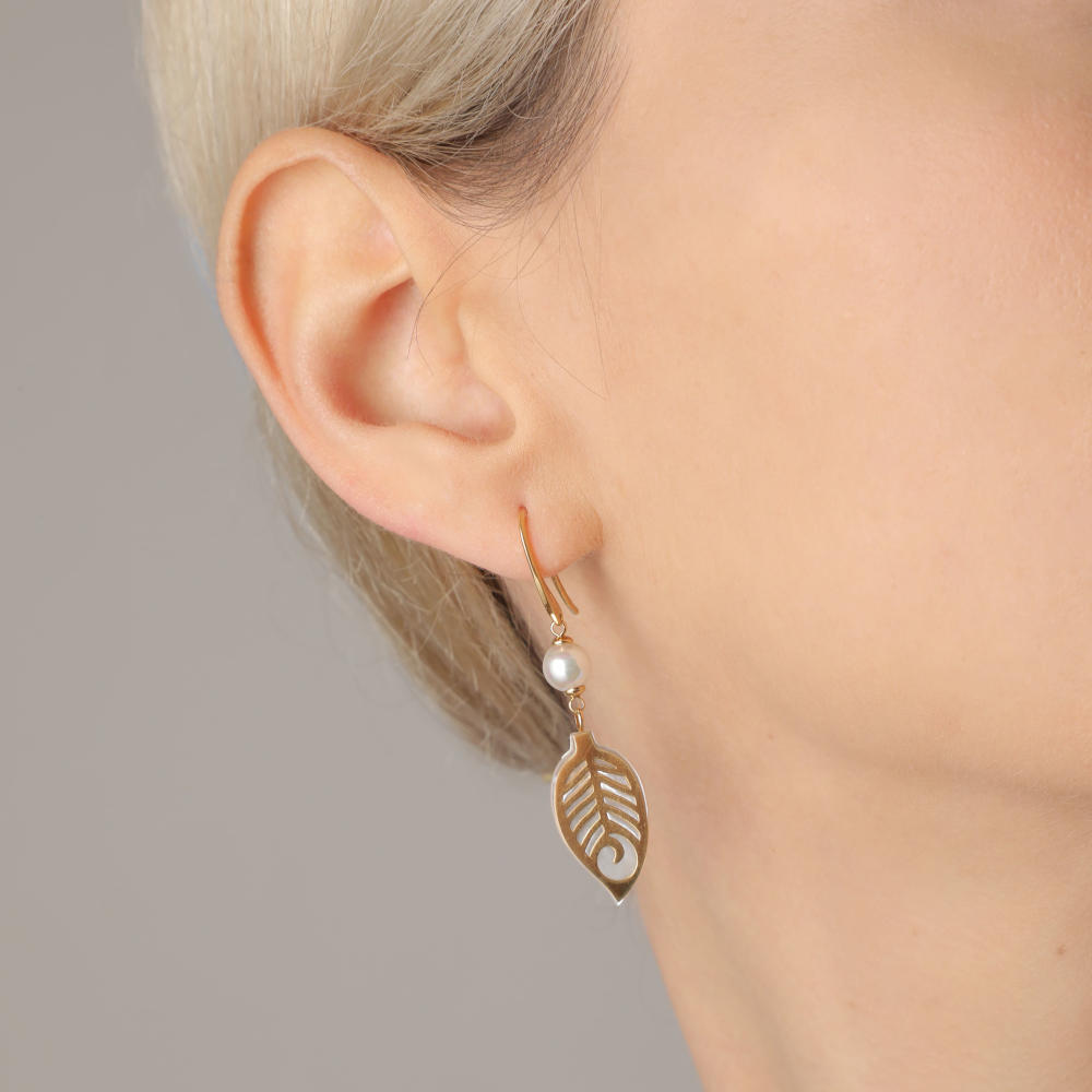 Long hook earrings in golden silver, 6 mm round pearls. Inspired by the beauty of small things, the collection has jewelry that materializes, with hanging leaves that are reminiscent of the laurel, the mythological nymph that bears its name.Long hook earrings in golden silver, 6 mm round pearls. Inspired by the beauty of small things, the collection has jewelry that materializes, with hanging leaves that are reminiscent of the laurel, the mythological nymph that bears its name.Long hook earrings in golden silver, 6 mm round pearls. Inspired by the beauty of small things, the collection has jewelry that materializes, with hanging leaves that are reminiscent of the laurel, the mythological nymph that bears its name.