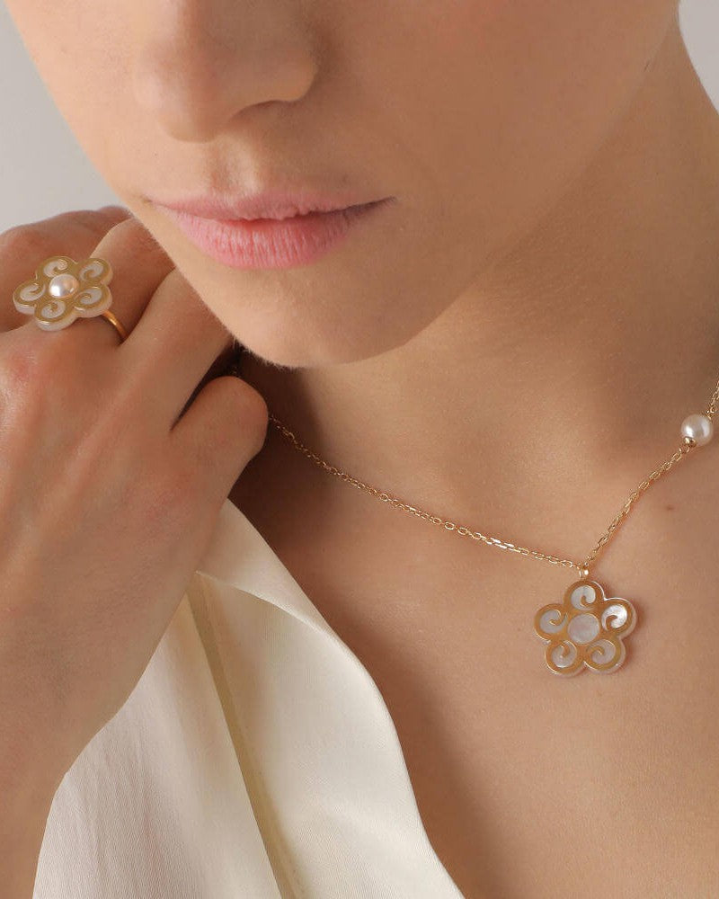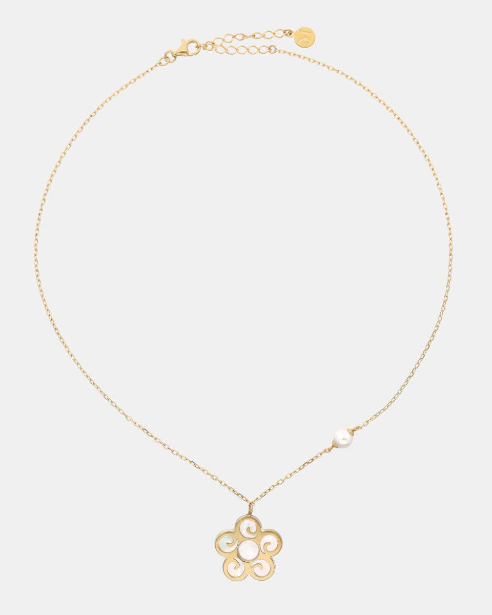 Short 3843 cm necklace in golden silver, 6 mm white round pearl. Inspired by the beauty and indisputable light of flowers, the collection is perfect for giving an elegant and stylish touch to your looks.Short 3843 cm necklace in golden silver, 6 mm white round pearl. Inspired by the beauty and indisputable light of flowers, the collection is perfect for giving an elegant and stylish touch to your looks.Short 3843 cm necklace in golden silver, 6 mm white round pearl. Inspired by the beauty and indisputable light of flowers, the collection is perfect for giving an elegant and stylish touch to your looks.