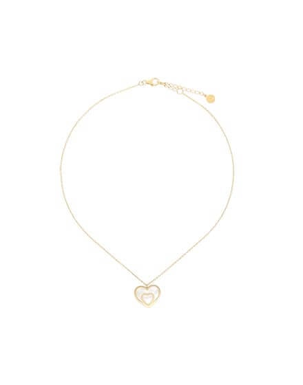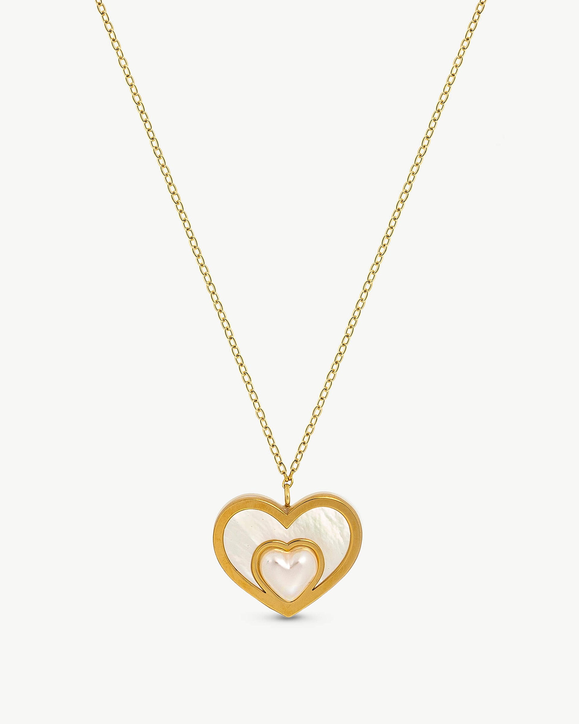 Pendant with 4045 cm long chain in golden silver, 8mm white heart pearl and mother of pearl also in the shape of a heart. It is the collection in honor of love.