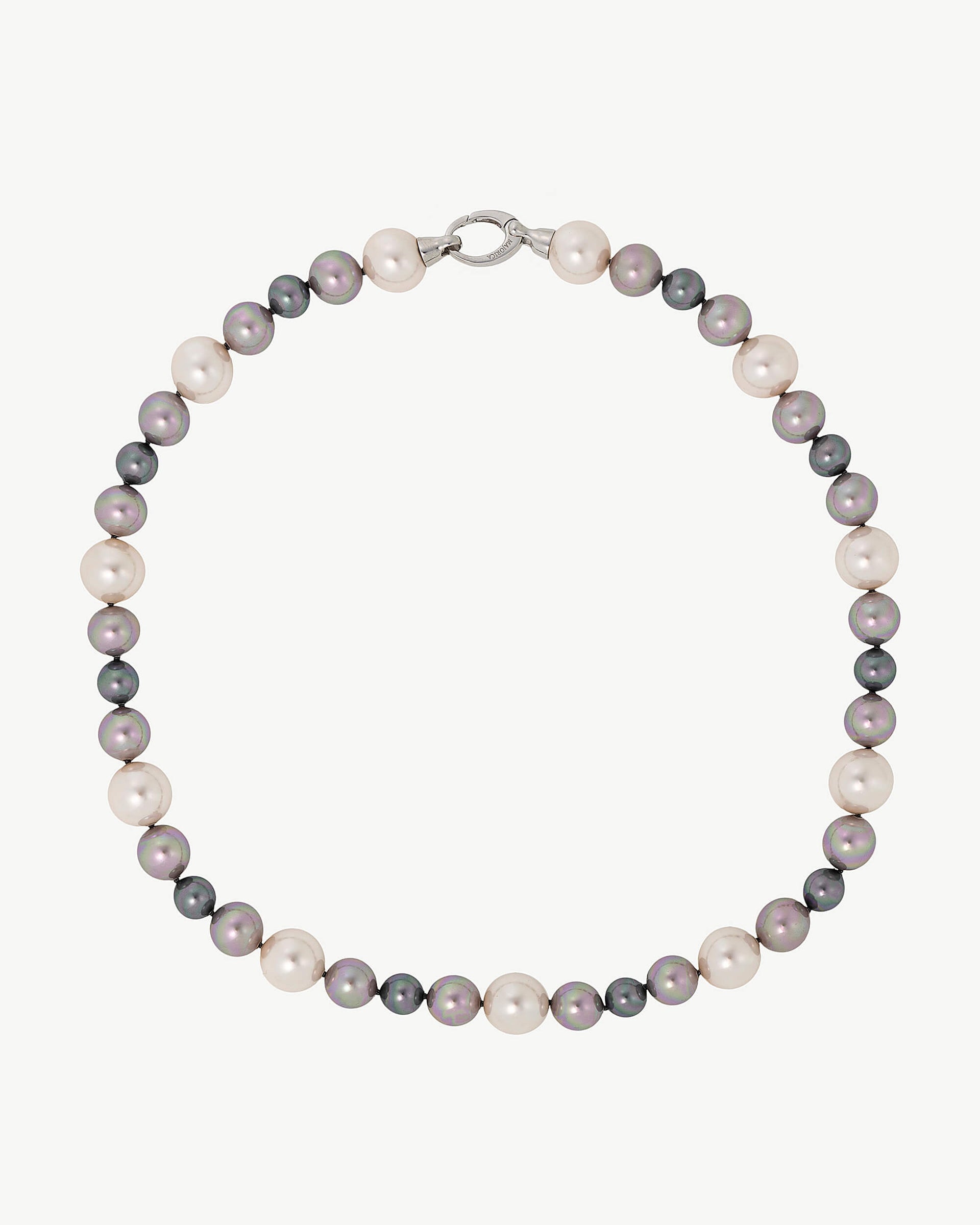 Short 46cm necklace in rhodium-plated silver, 812mm round white, gray and nuage pearls. The collection is a contemporary jewelry collection, created with round organic pearls with an exquisite color range combination.Short 46cm necklace in rhodium-plated silver, 812mm round white, gray and nuage pearls. The collection is a contemporary jewelry collection, created with round organic pearls with an exquisite color range combination.Short 46cm necklace in rhodium-plated silver, 812mm round white, gray and nuage pearls. The collection is a contemporary jewelry collection, created with round organic pearls with an exquisite color range combination.
