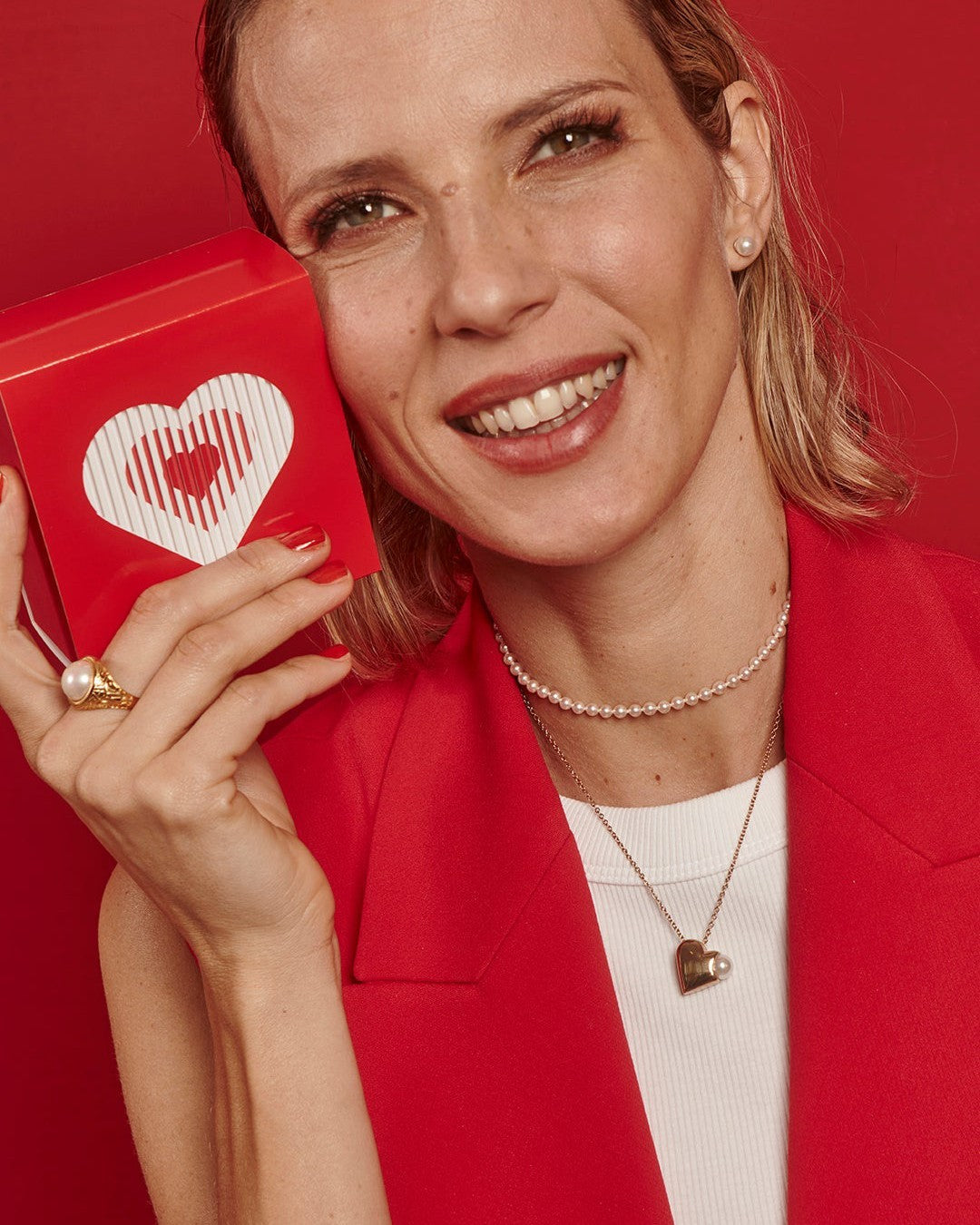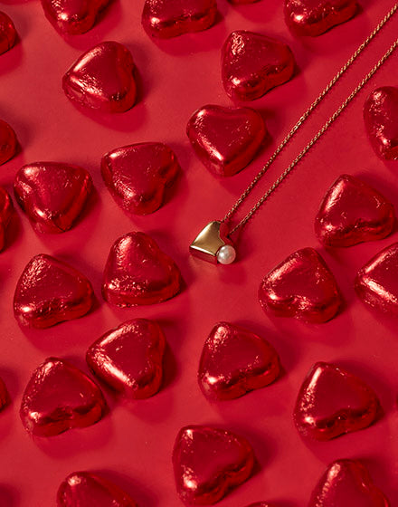Heart pendant with gold steel chain. 8mm round white pearl. Length 40cm. A bite of true love.