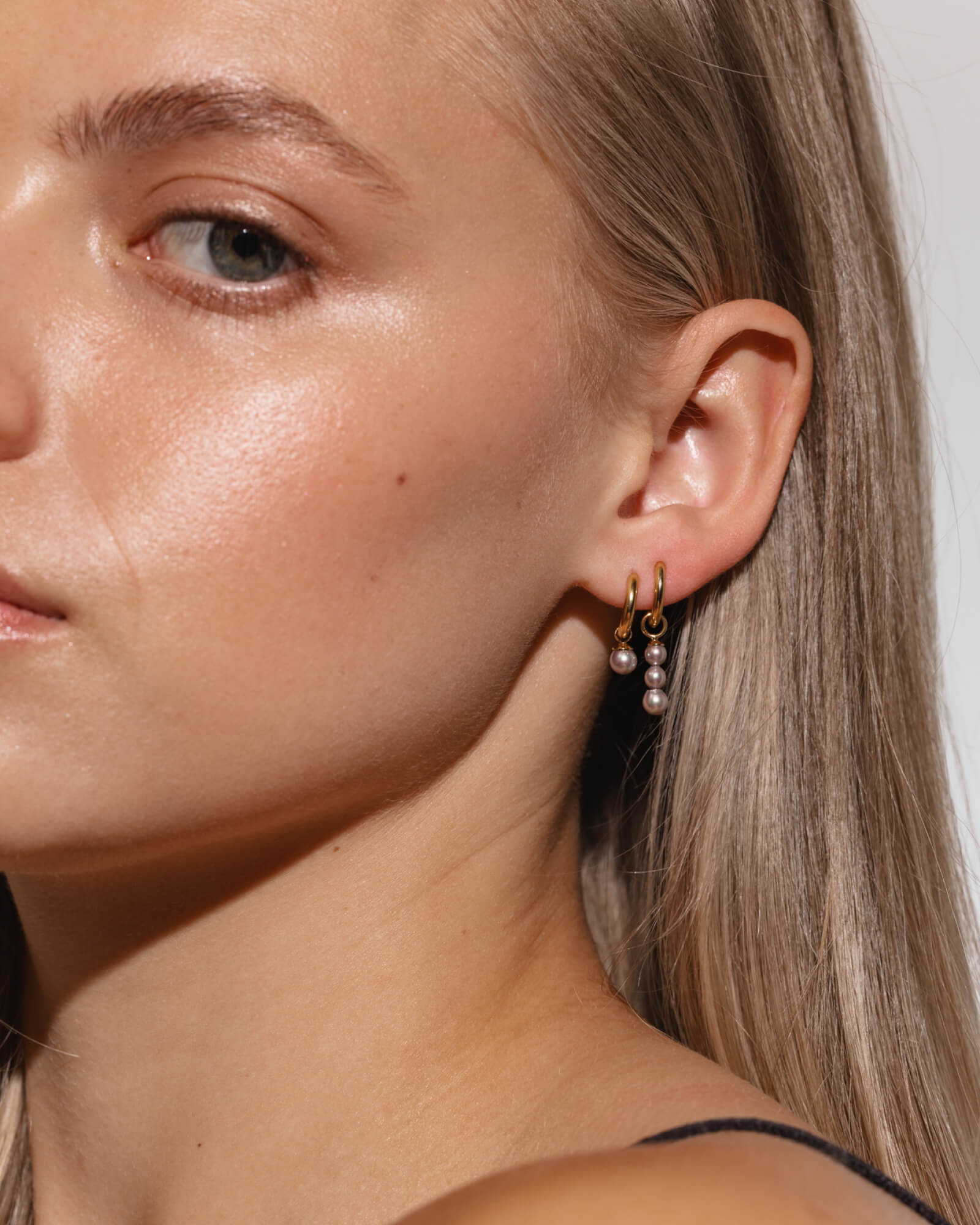The collection offers a versatile chain base for hanging mini hoop or small hoop earrings, with 4 mm pearls in exclusive colors.