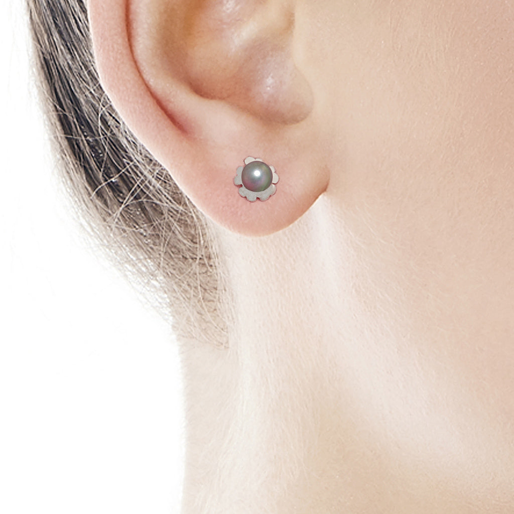 Star-shaped earrings in rhodium-plated silver, 4mm nuage round pearl. These earrings have a spike closure.