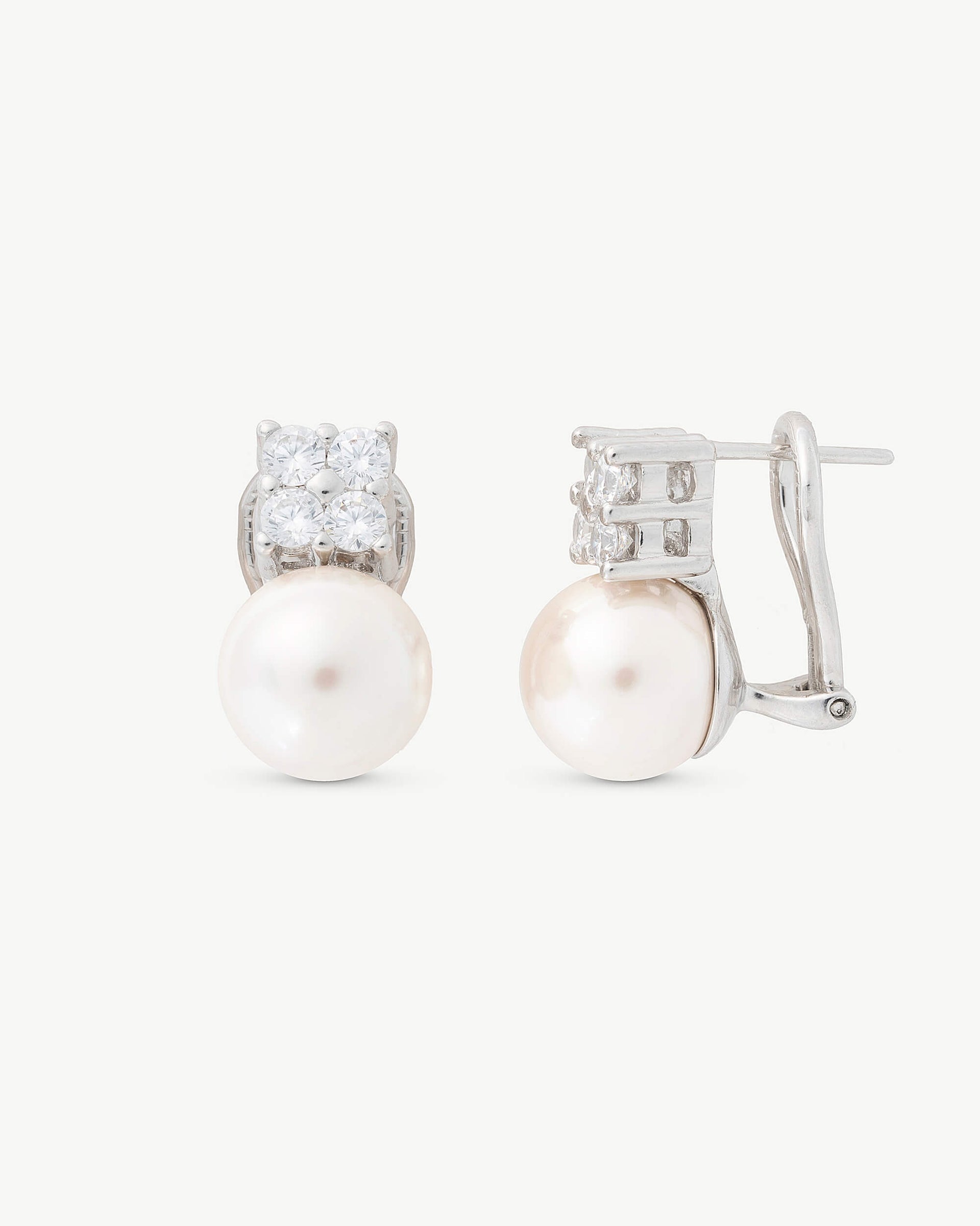 Omega earrings with short spikes in rhodium-plated silver, 10mm white round pearls and zircons. Jewelry for your daily life.