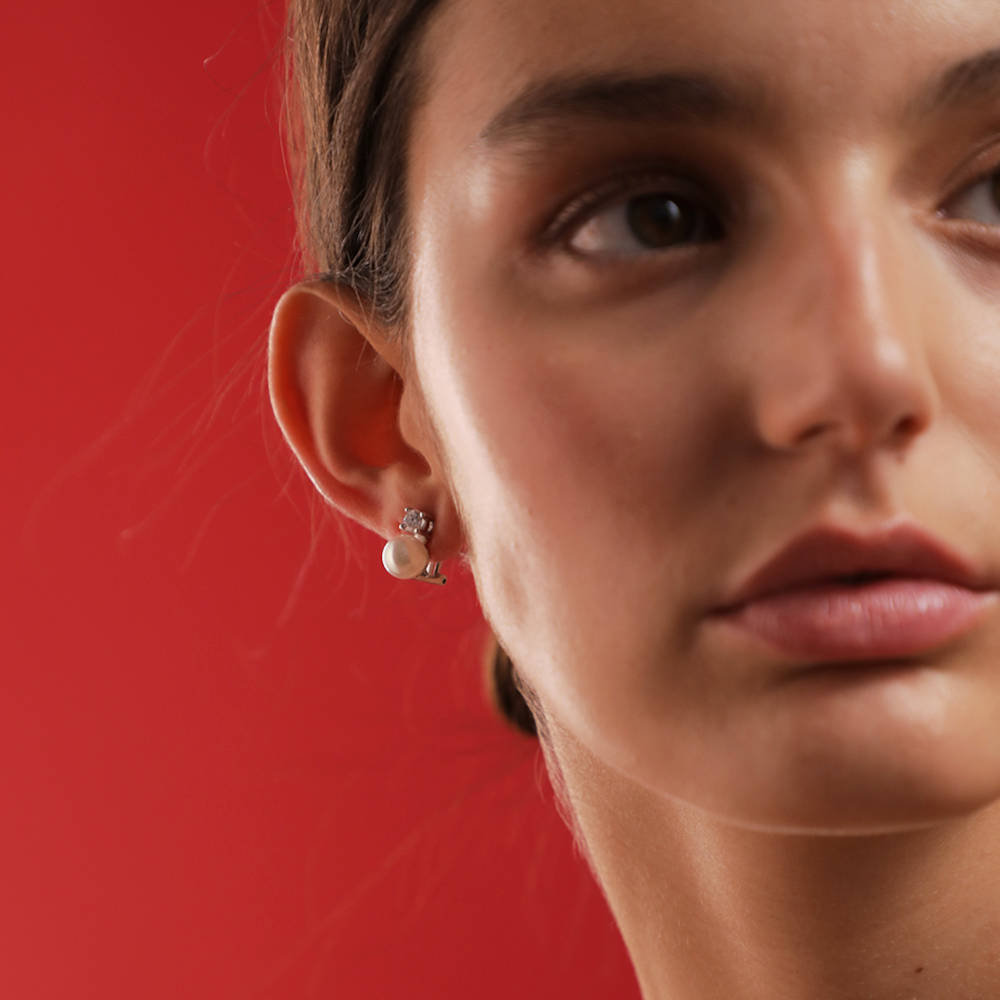 Earrings with omega closure with spike. Made in rhodium-plated silver. With 9mm white round pearls. adorned with zircons.Earrings with omega closure with spike. Made in rhodium-plated silver. With 9mm white round pearls. adorned with zircons.Earrings with omega closure with spike. Made in rhodium-plated silver. With 9mm white round pearls. adorned with zircons.
