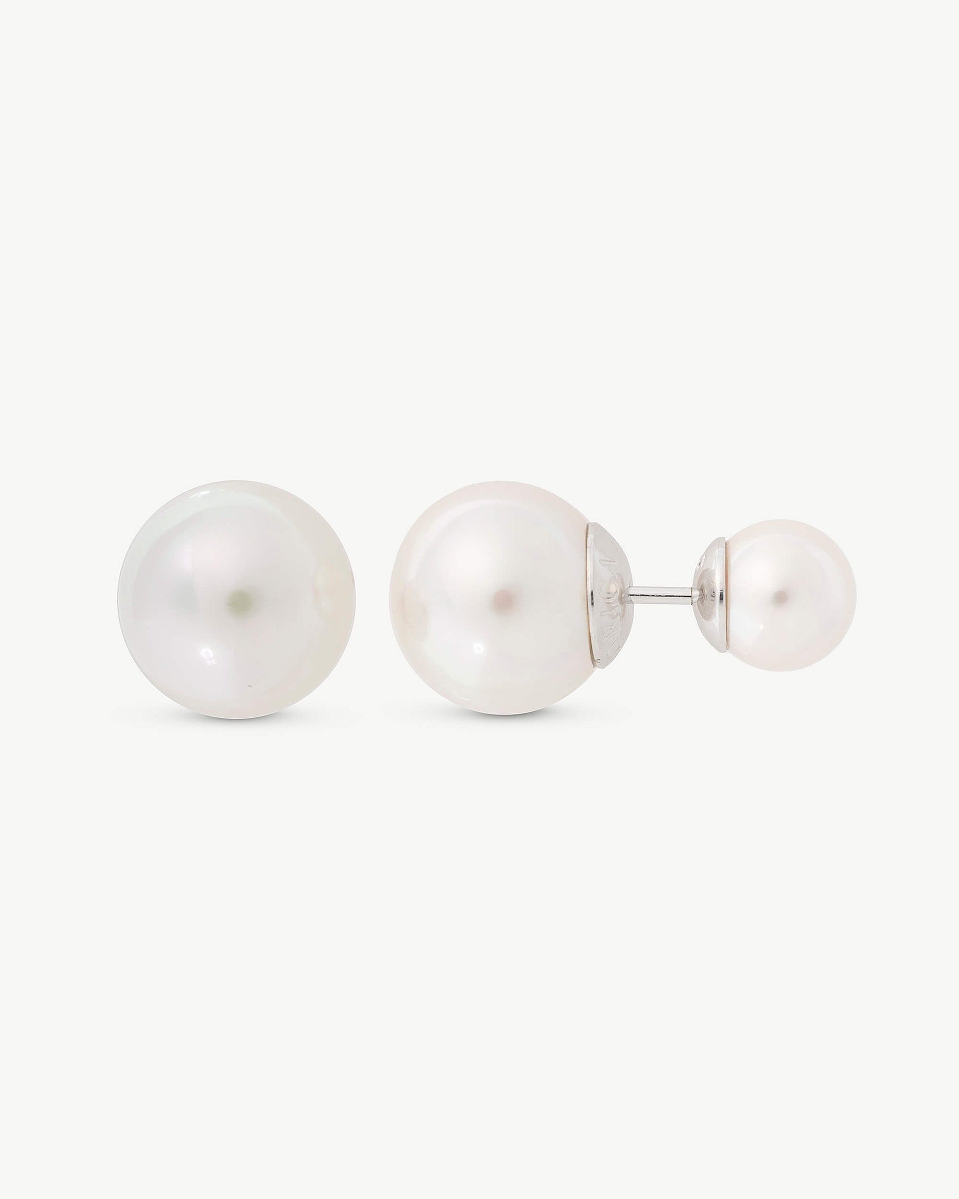 Double spiked ball earrings in rhodium-plated silver, 812mm white round pearls. gives its name to a collection of double Majorica pearl earrings.