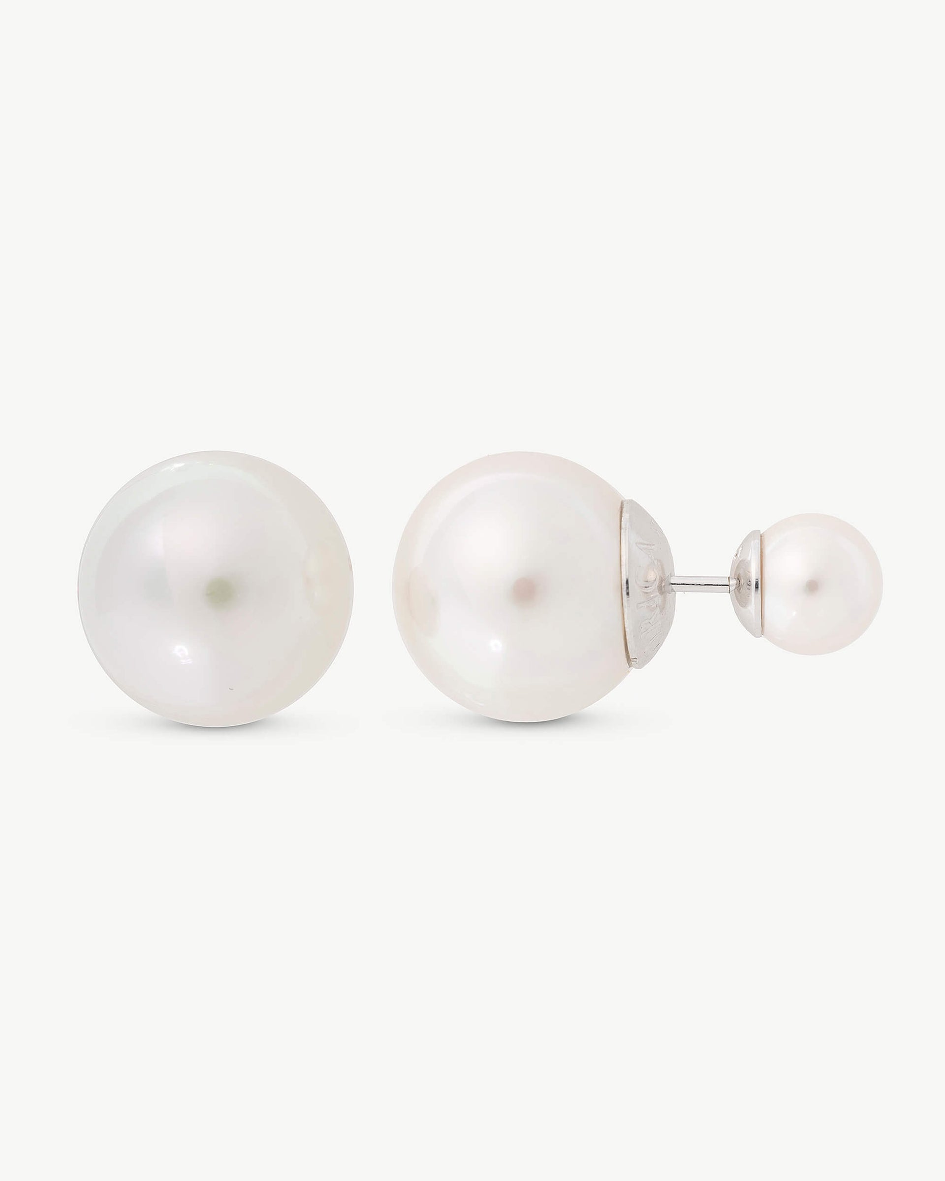 Double spiked ball earrings in rhodium-plated silver, 814mm white round pearls. gives its name to a collection of double Majorica pearl earrings.