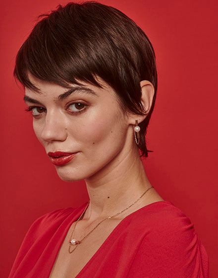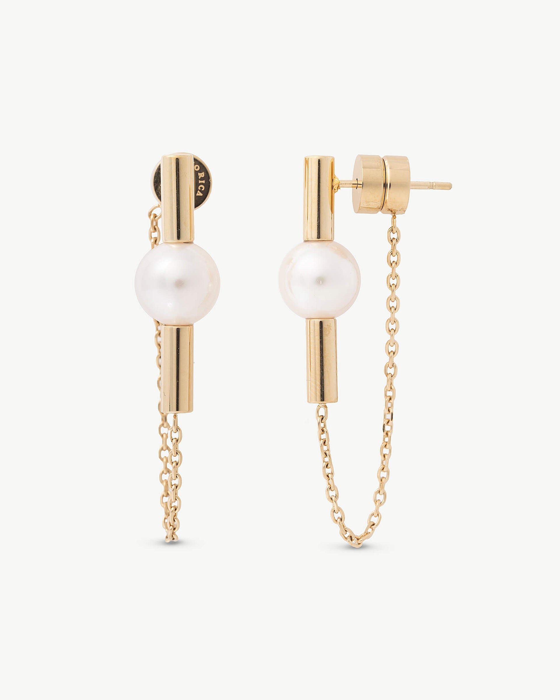 Golden steel chain earrings. 8mm white round pearl and spike closure. Pure less is more style.Golden steel chain earrings. 8mm white round pearl and spike closure. Pure less is more style.Golden steel chain earrings. 8mm white round pearl and spike closure. Pure less is more style.