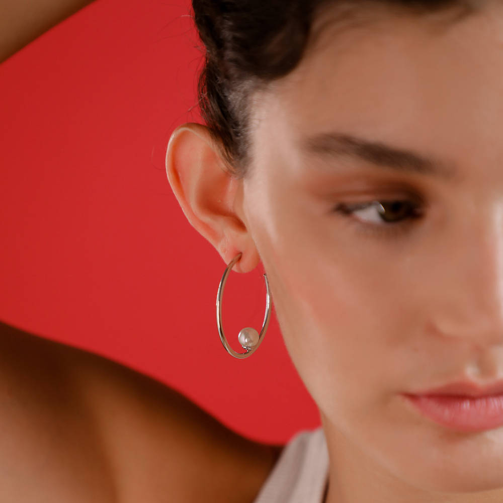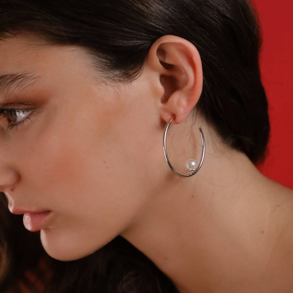 4cm hoop earrings with spike in rhodium-plated silver, 8mm white round pearl.