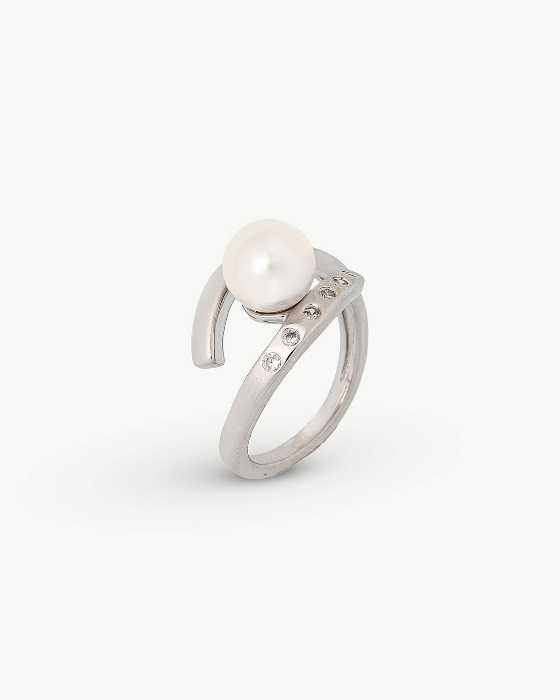 Open ring in rhodium-plated silver, 8 mm white round pearl and zirconia. Jewelry for your daily life.