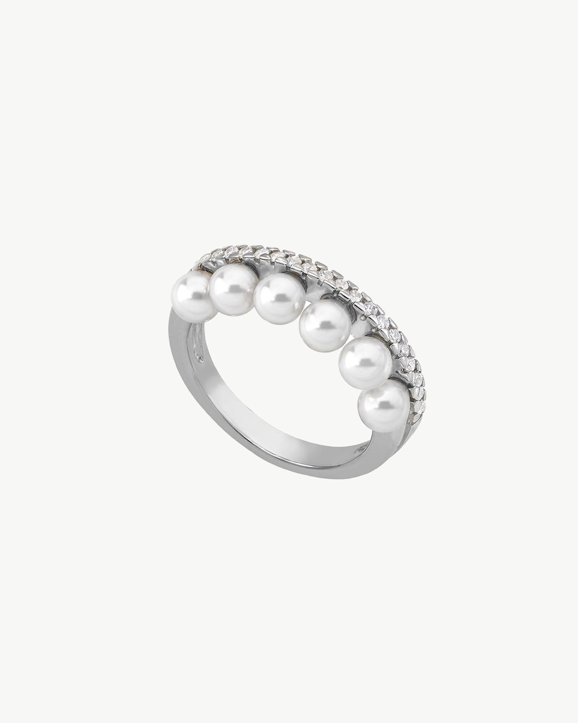 Silver ring, with 4mm round white pearls. and zircons. Along with pearls, zircons take center stage in this exquisite collection.